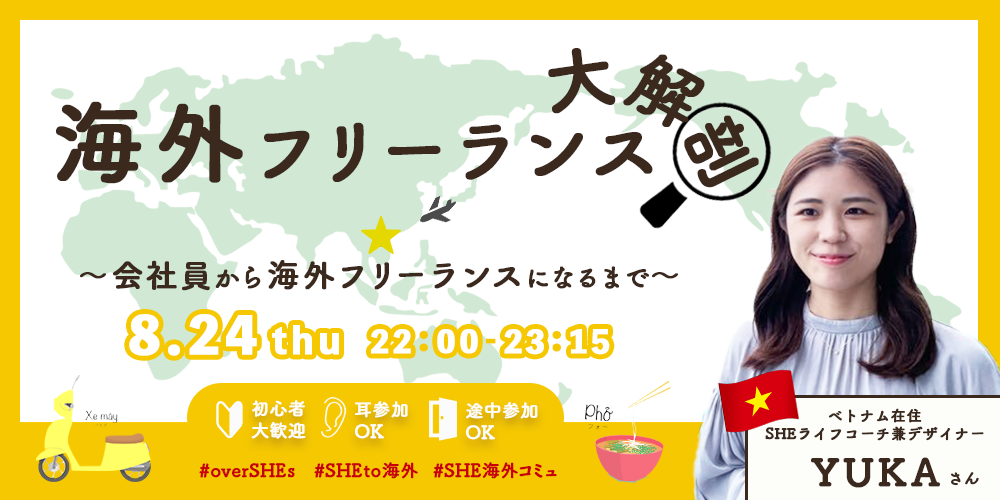 SHElikes公式コミュニティ「海外コミュニティ」でイベントバナーを制作。 約240名から参加表明いただけました。 ◇制作期間:3時間程度 ◇使用ツール:Photoshop