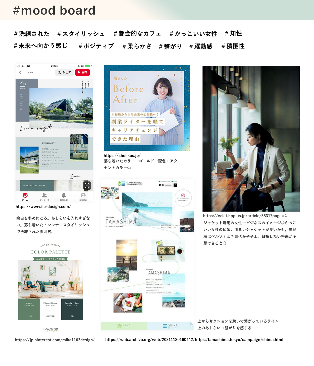 制作の前段階ではムードボードの作成をしますが、その際参考デザインを深掘りして言語化することも重要であり、参考サイトのどの部分をどう活かすか明確にしてまとめることで、チームでの制作時はディレクターや他のデザイナー、クライアントと認識の共有ができるということにも気づきました。