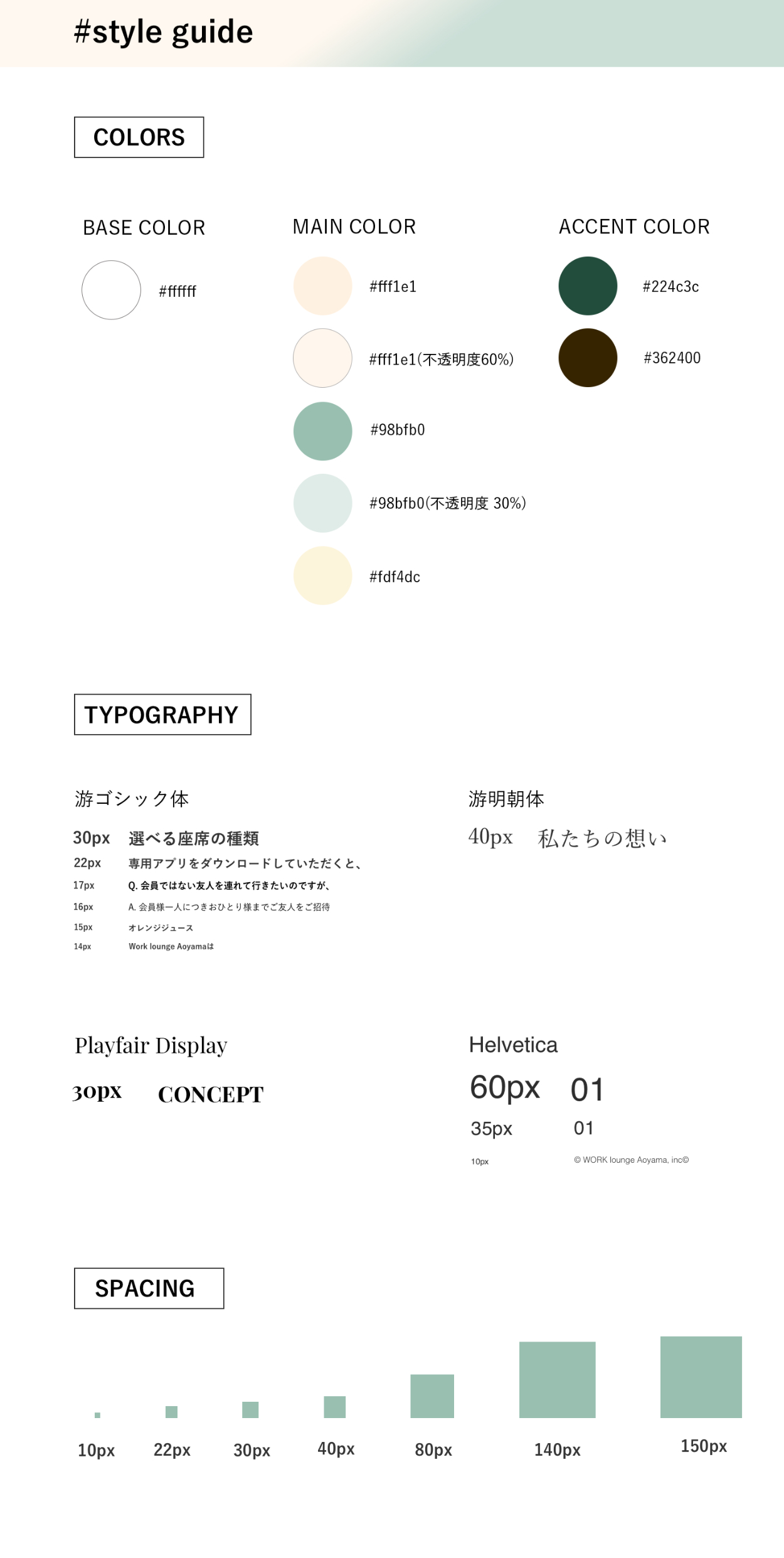 青山という立地を考えた際に、おしゃれで洗練された雰囲気をイメージした。さらに、都会でありながら緑が多く、落ち着いた雰囲気も感じられたことから、グリーンをベースとした配色にした。大人の女性の落ち着きや、女性としての柔らかさやしなやかさ、ペルソナのポジティブな躍動感も考慮し、配色を決めた。