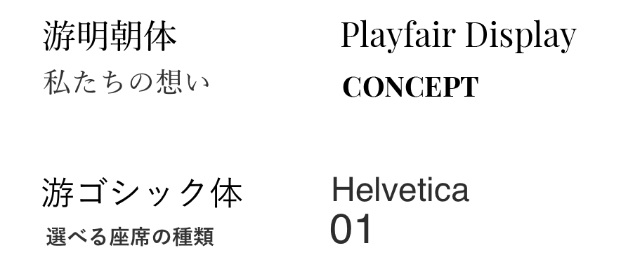 セクション日本語タイトルに使用。サイト全体の世界観でもある「落ち着いた大人の女性」を後押しする目的があるため大人っぽく、真面目で、落ち着いた印象のフォントを選択。