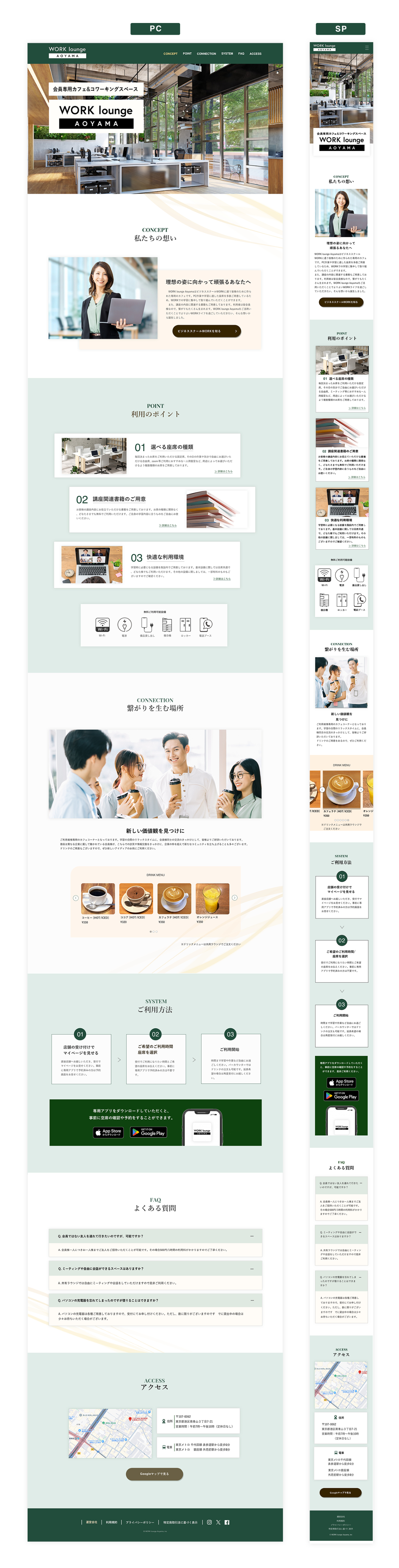 SHElikes PROデザイナーにて、会員専用カフェ&コワーキングスペースWORK lounge AOYAMA様のLPデザイン制作をしました。 【制作年月:2025.5/制作期間:2週間/制作時間:ワイヤーフレームの変更・追加提案25時間、デザインカンプ30時間】