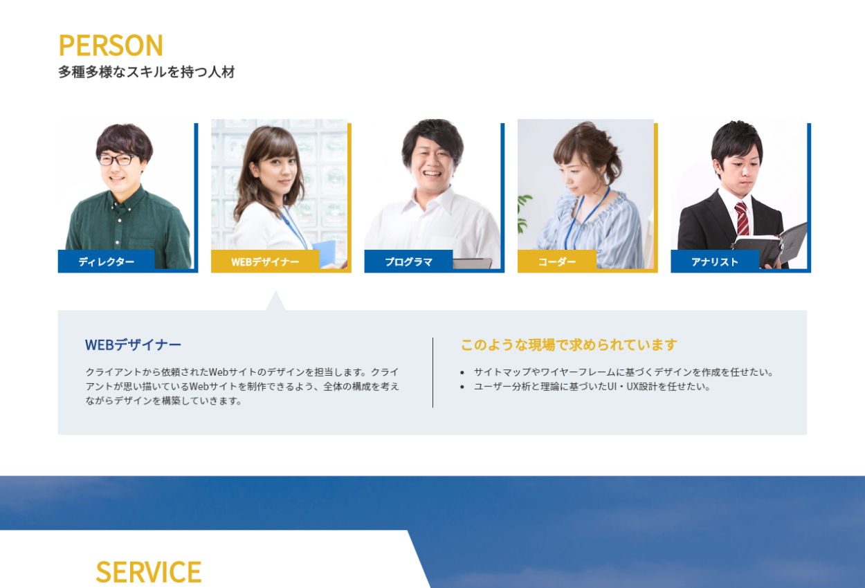 人材紹介の部分、吹き出し風のタブ切り替えになっています。