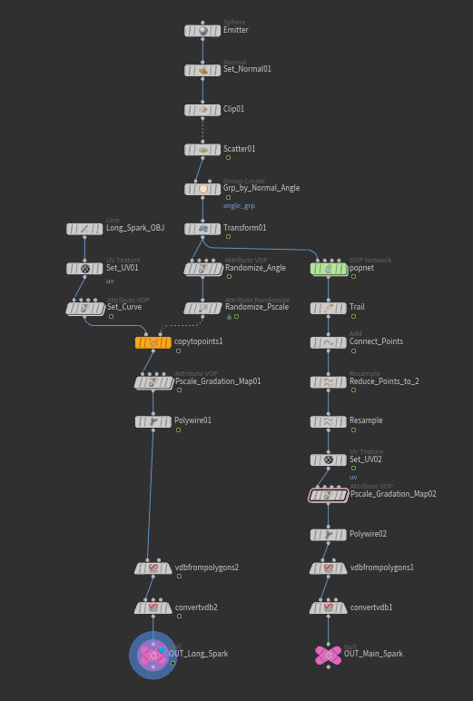 - 火花はpscale値にグラデーションをかけた上で一旦VDB化させ、手書き感を表現させている。