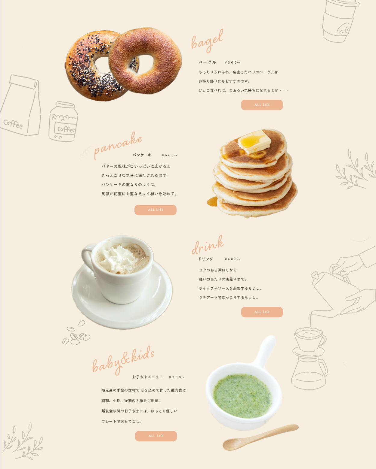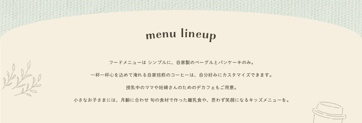 ③左右の線画でナチュラルな雰囲気を壊さない、かつカフェの雰囲気を体感してもらいやすいようなデザインにした。