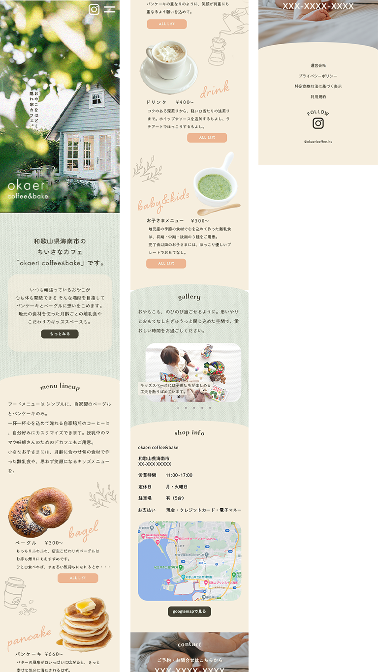 ③コンセプトでもある、木漏れ日溢れるこぢんまりとしたカフェに近い写真を選んだ。離脱されないよう思わずスクロールしたくなるような世界観を意識した。