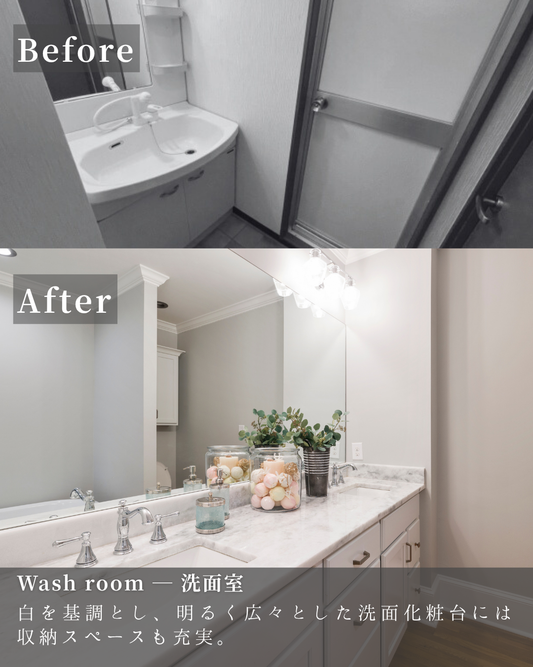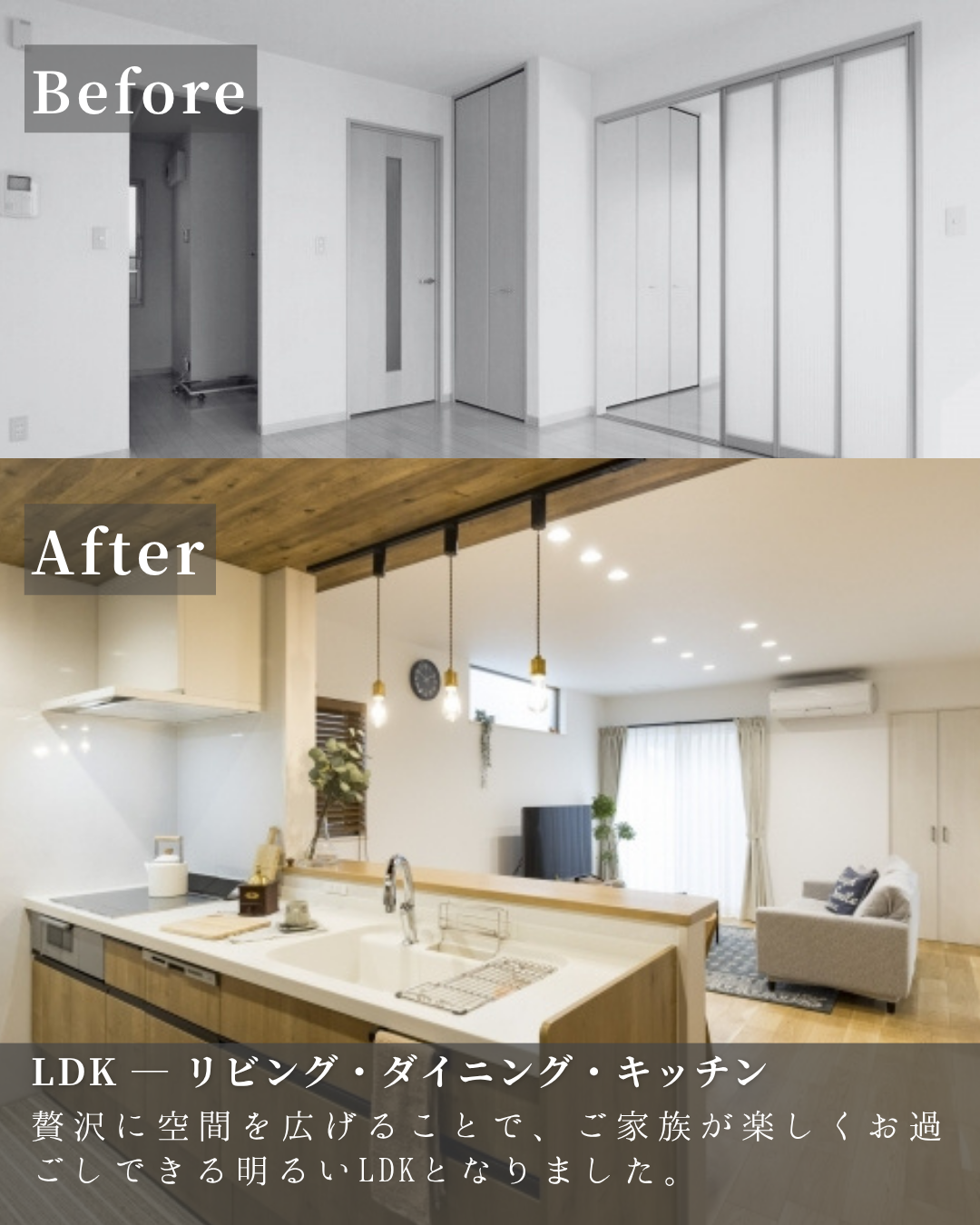 ・築年数があってもそれを感じさせない、ここまできれいになる、ということが伝わるよう、リフォーム前、リフォーム後の写真を載せ変化を比較できるような構成にしました。