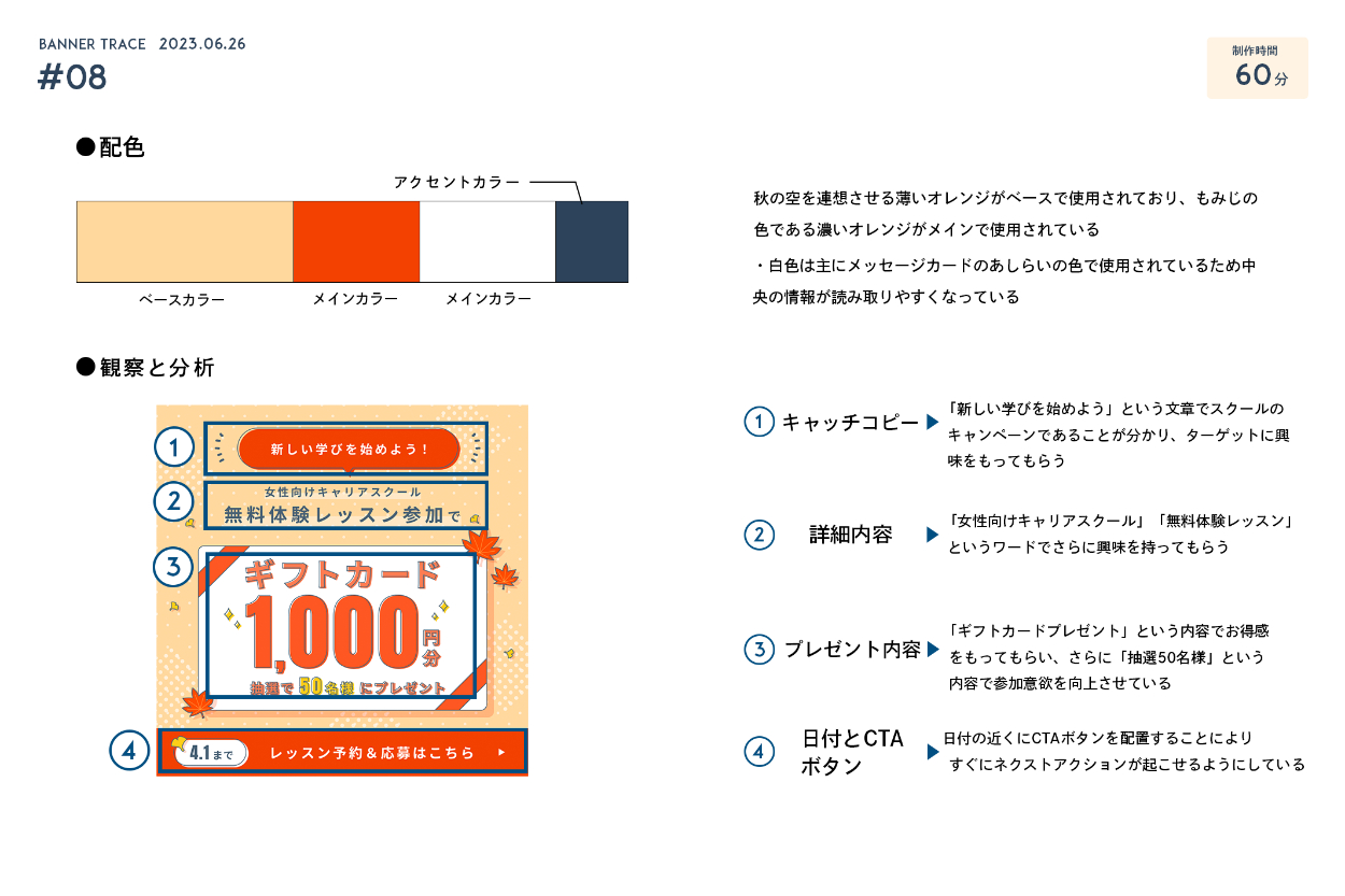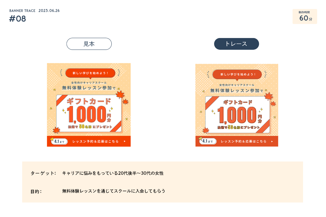 SHE likesの制作課題として、バナートレースに取り組みました。 「ターゲット」「目的」「配色」「視線誘導」の分析結果もまとめています。 [制作時間:60分/まとめ30分/使用ツール:Figma]