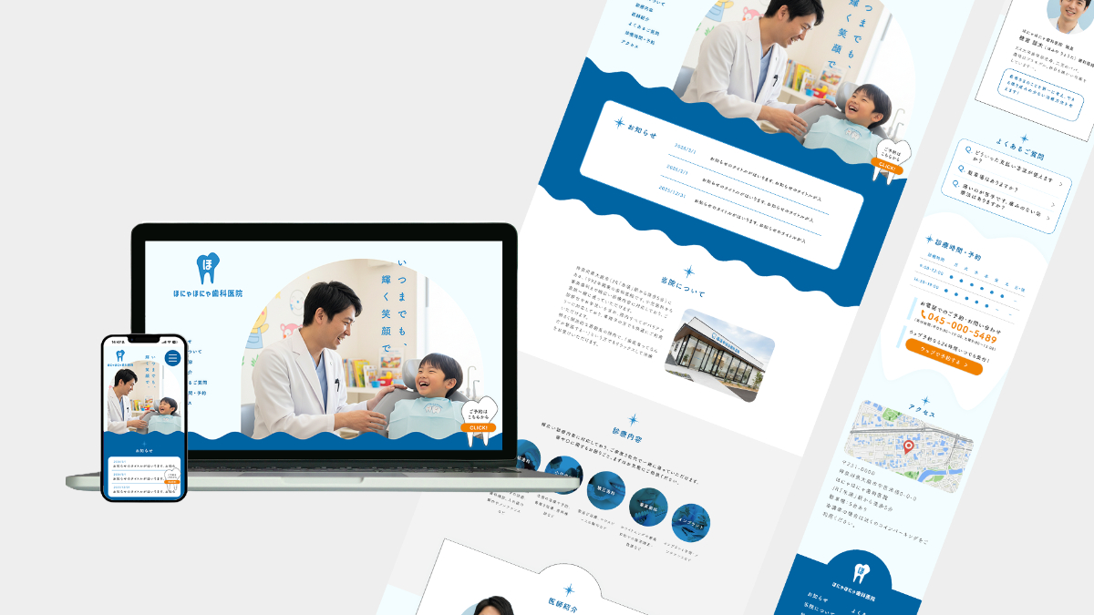 架空の歯科医院のWebサイト(トップページ)です。医院のイメージカラーであるブルーを基調に、情報を簡潔にまとめました。また、予約ページへのリンクボタンを常に表示画面上(右下)に固定することで、既存顧客(再診の患者)が最短で予約ページにアクセスできるようにしました。