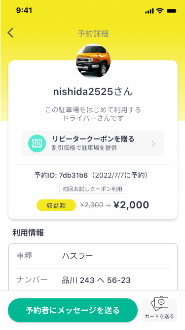 このような駐車場オーナーの気持ちを想定し、ユーザー名や車両情報以外にも利用回数の表示を提案しました。