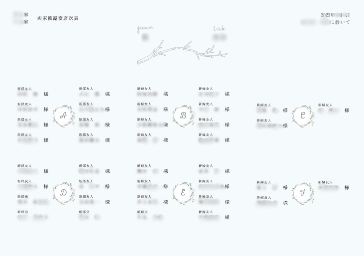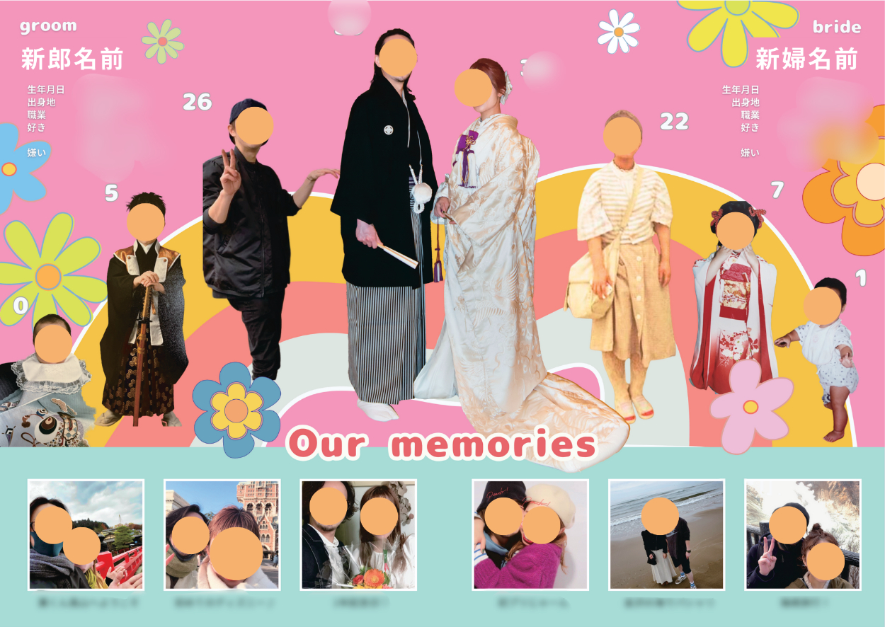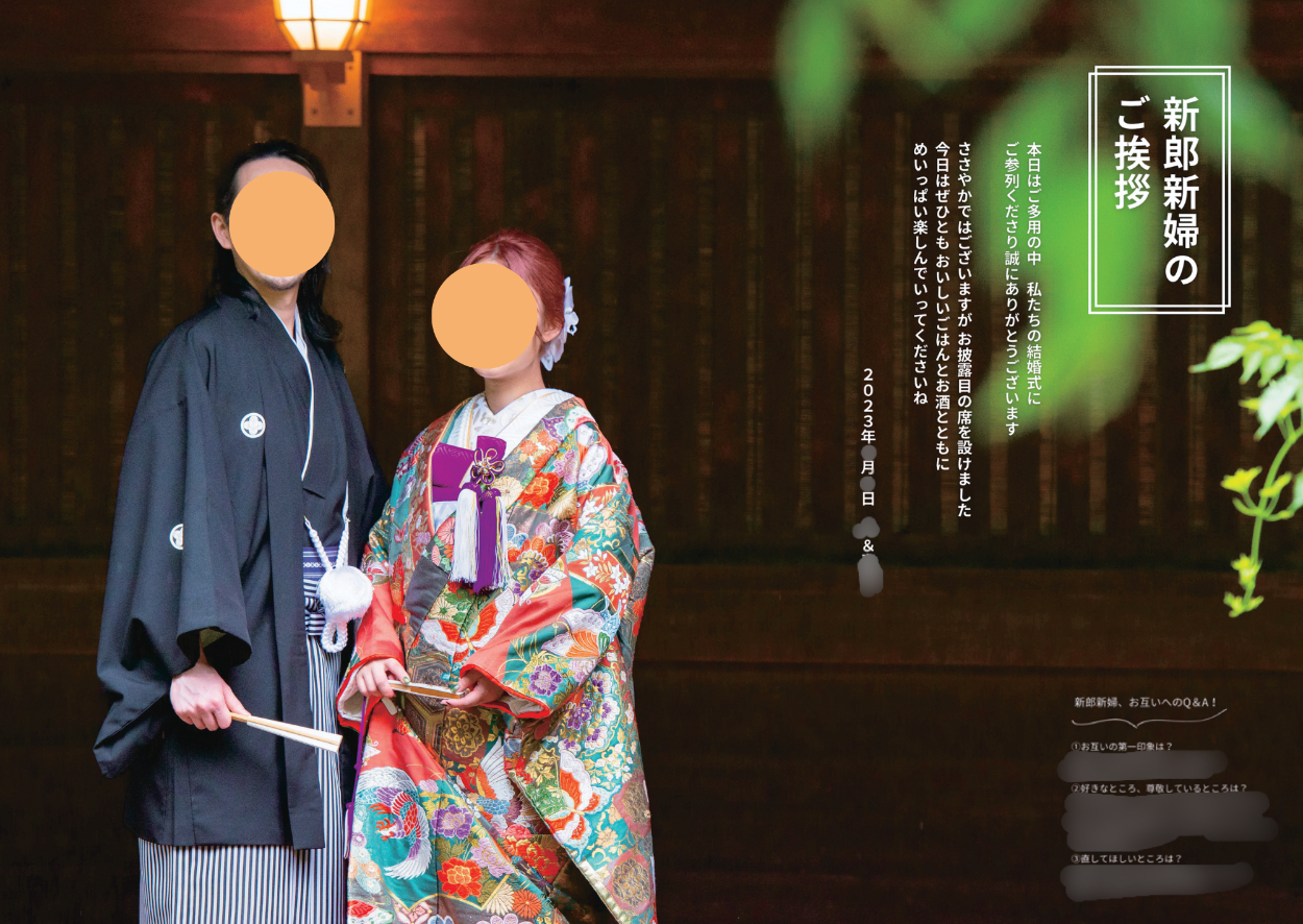 雑誌風デザインのため、2枚目「新郎新婦のご挨拶」のページ右下に小さくお互いへのQ&Aを取り入れました。(※内容はモザイクで伏せています)