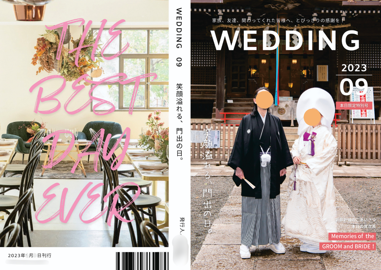 表紙は和装のお写真を使用したため、日本らしく縁起の良さをイメージし赤・白ベースに制作しました。