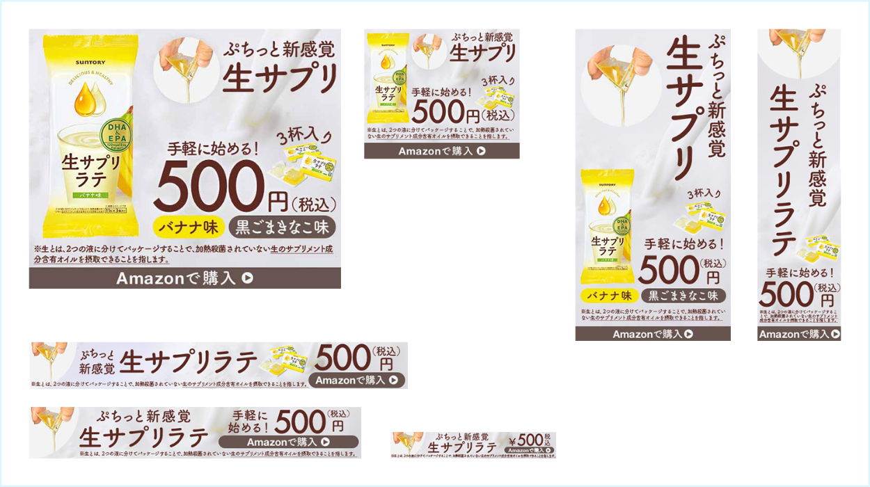 「サントリー社様:新商品「生サプリラテ」ペルソナ・訴求軸&バナー」 - サントリー社様「生サプリラテ」をご提供いただき、実際に試供した上でペルソナ・訴求軸の提案、バナーを制作しております。