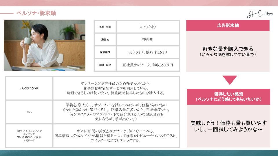 SHElikes様コンペ企画 サントリー社様:新商品「生サプリラテ」ペルソナ・訴求軸&バナー