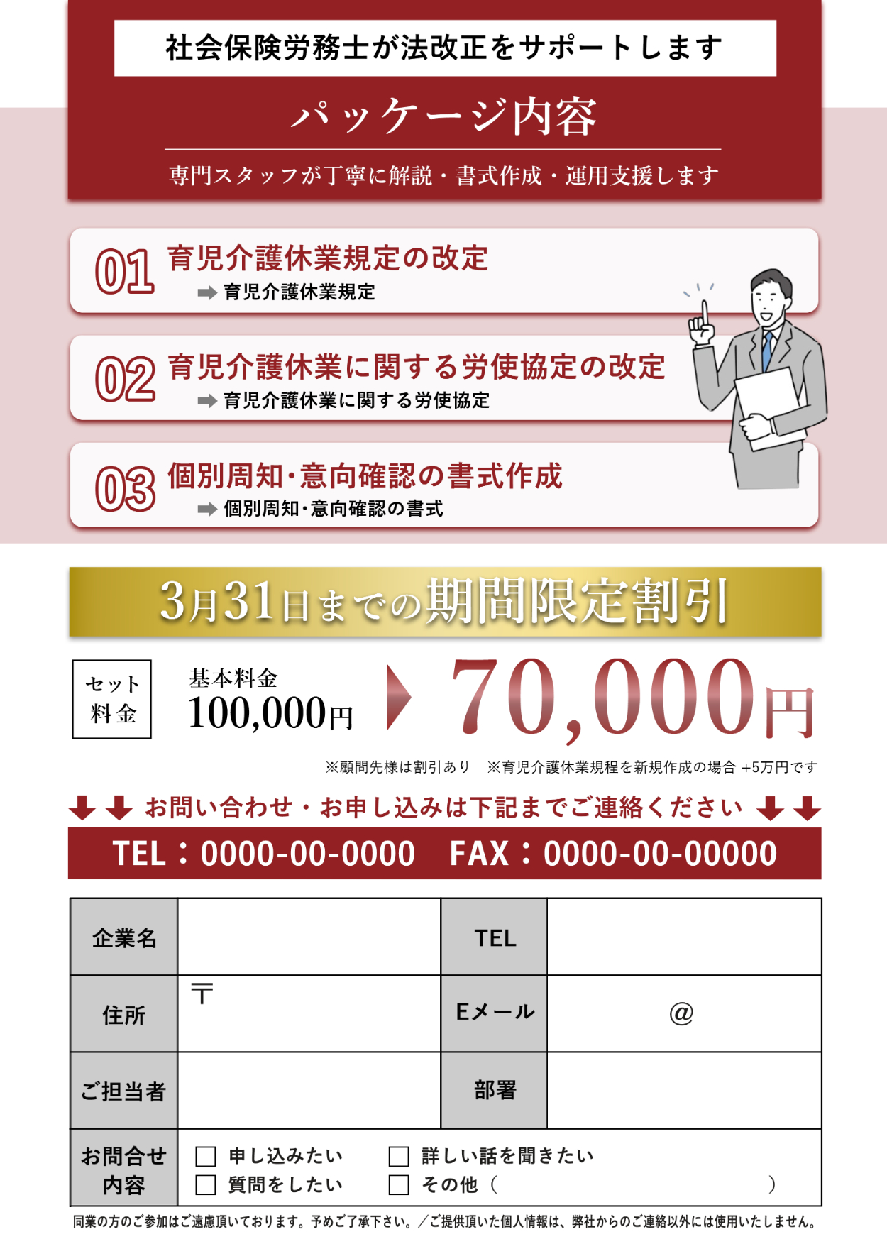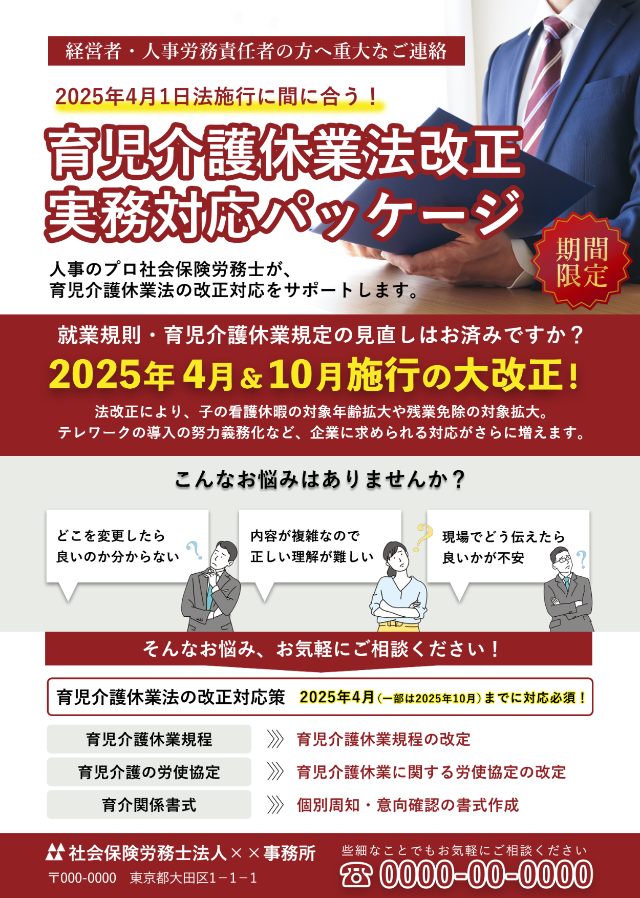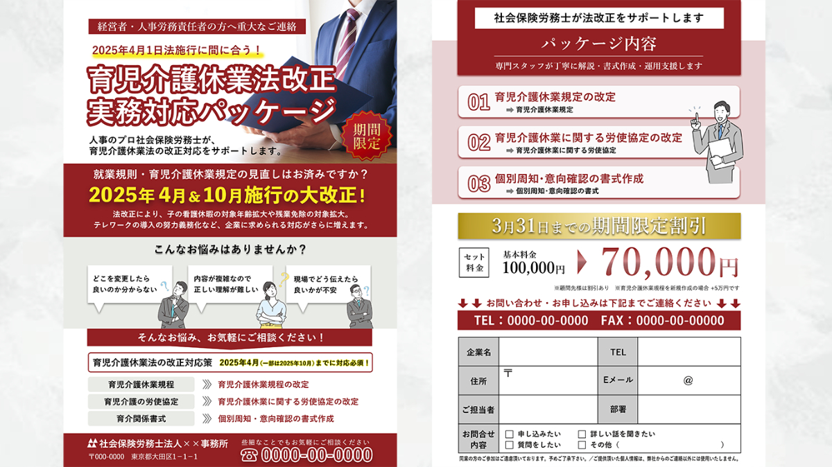 2025年4月から育児休業法が改定されるため、企業は様々な法改正を行う必要がある。その業務を社労士の方が支援するために、チラシを通してパッケージにお申し込み、またはお問い合わせをいただく。