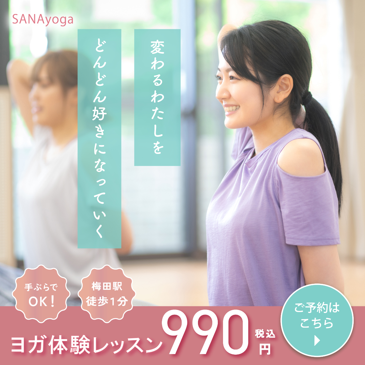 - 横を向いて笑顔でヨガをする写真を選び、前向きに明るく変わっている女性を表現しました。