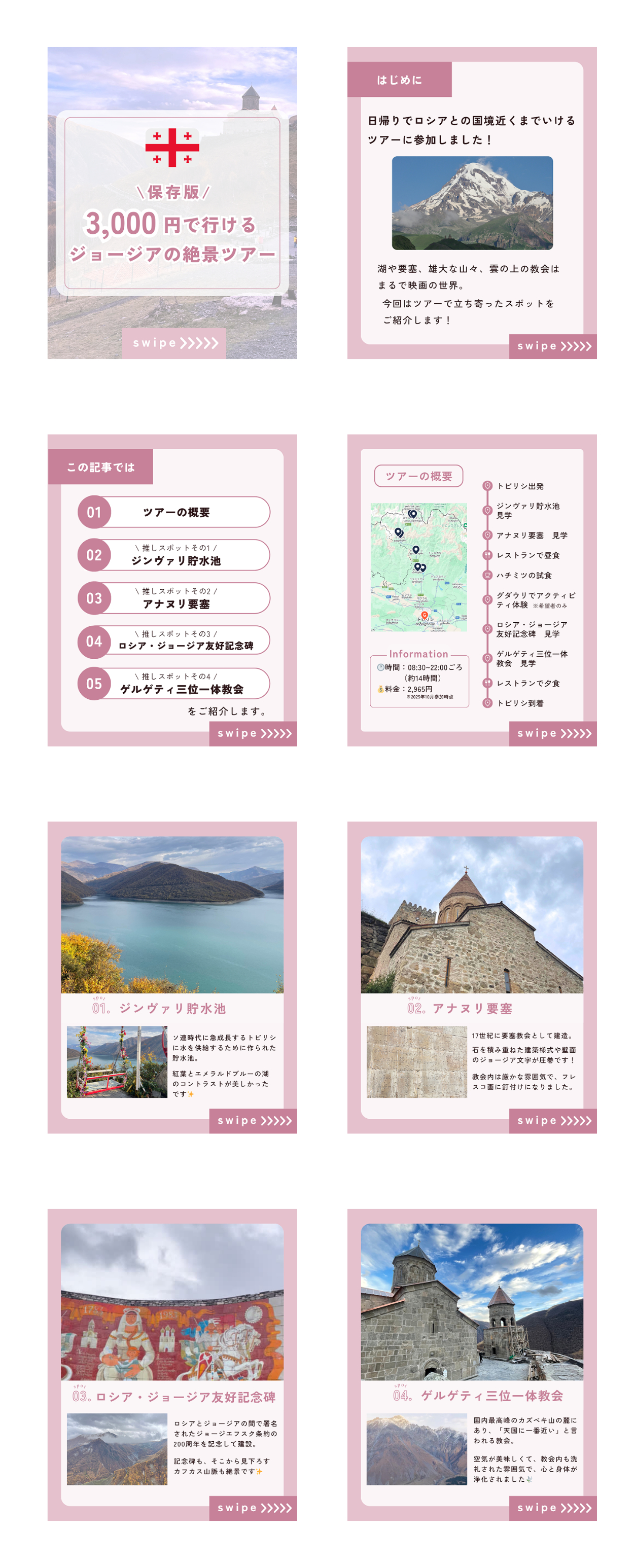 自主制作で、旅系アカウントに掲載する投稿デザインを作成しました。(制作時間:4時間、使用ツール:Canva)