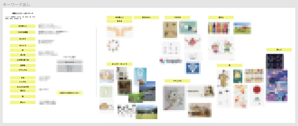 農園ふじさと様と一緒に、「農園ふじさとっぽいワード」出しワークショップを行いました。また出てきたワードを元に、さらにイメージのすり合わせや、ビジュアルを用いて視覚的な情報整理とイメージのすり合わせを行いました。
