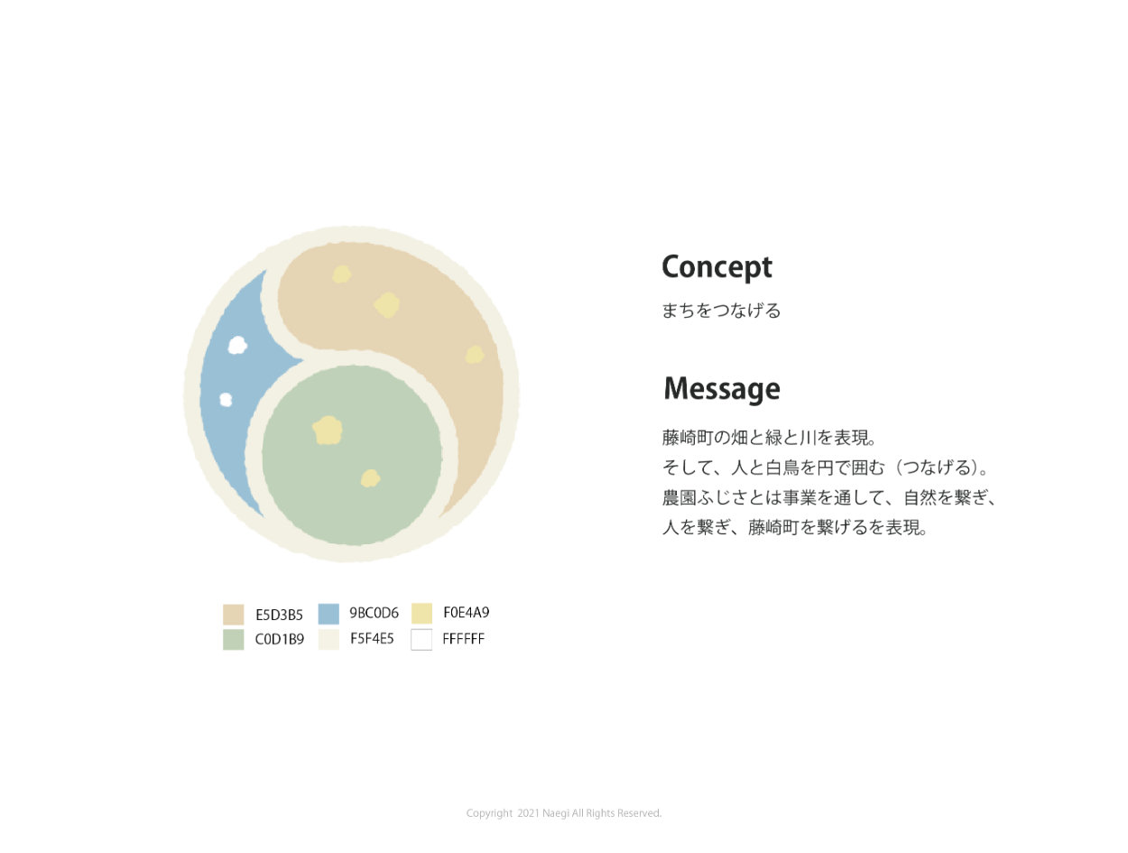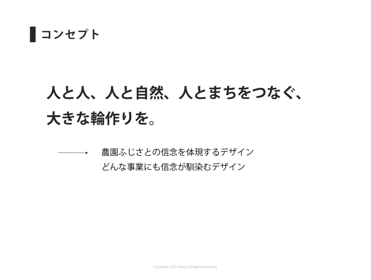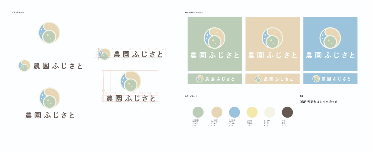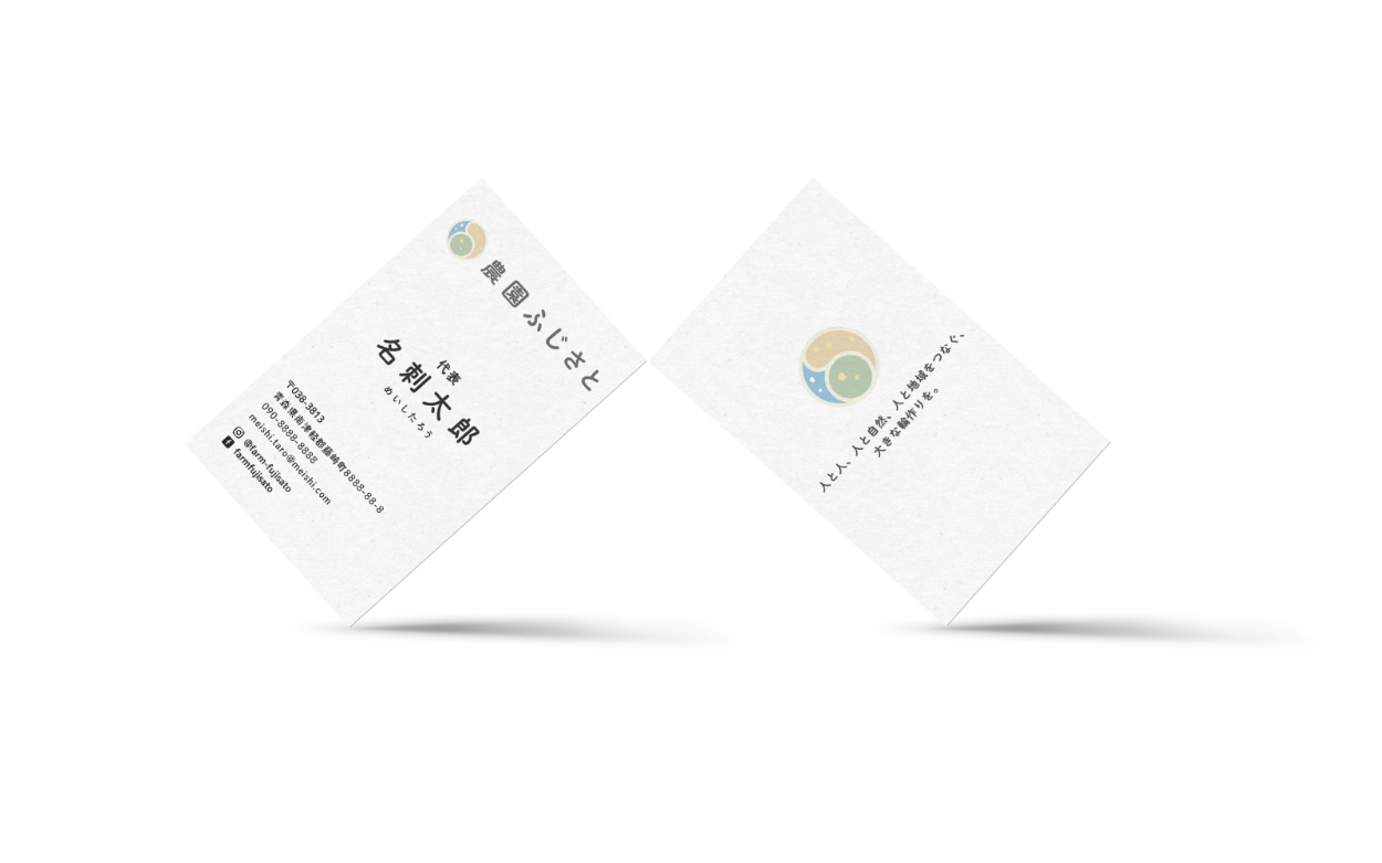 ロゴデザインとしては、農園ふじさと様の農園がある青森県藤崎町の畑と緑と川を「ふ」の形をモチーフに表現し、ビジョン・ミッションを表現するデザインを行いました。