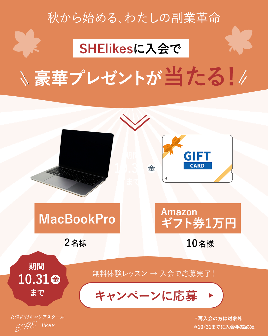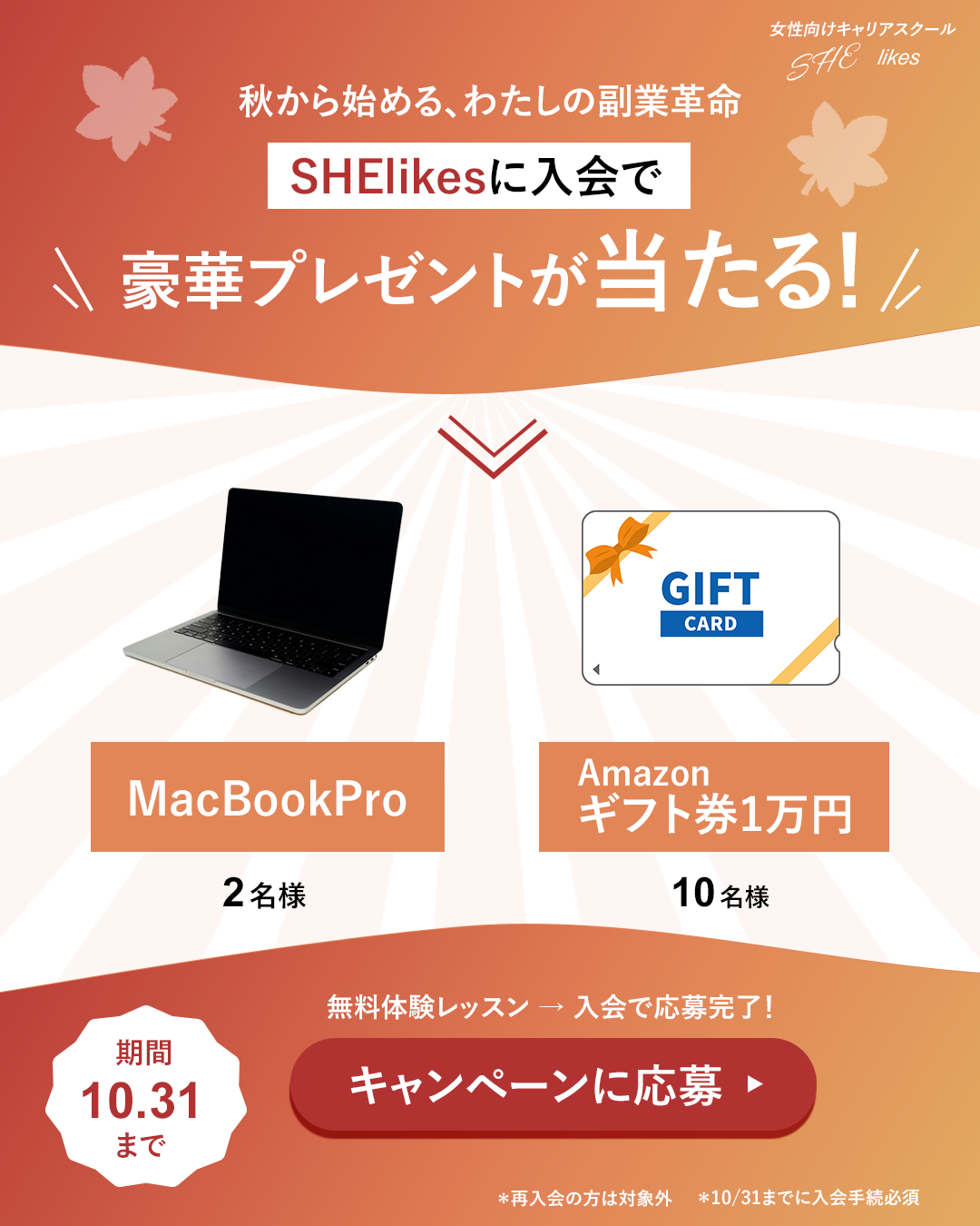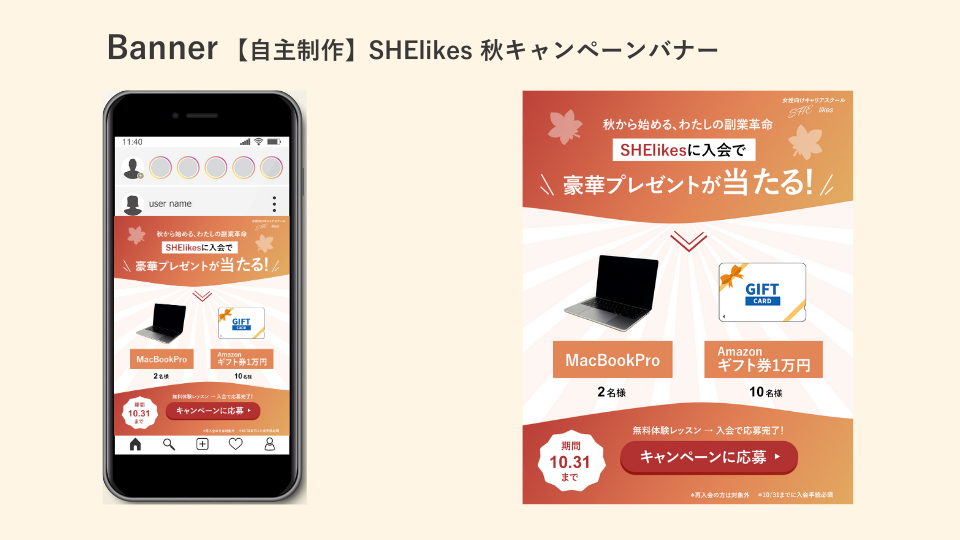 ・制作背景:秋のSHElikes入会キャンペーンを想定したnstagram広告バナーを制作しました。(2025年1月に改訂されたサイズ 1080×1350で制作)
