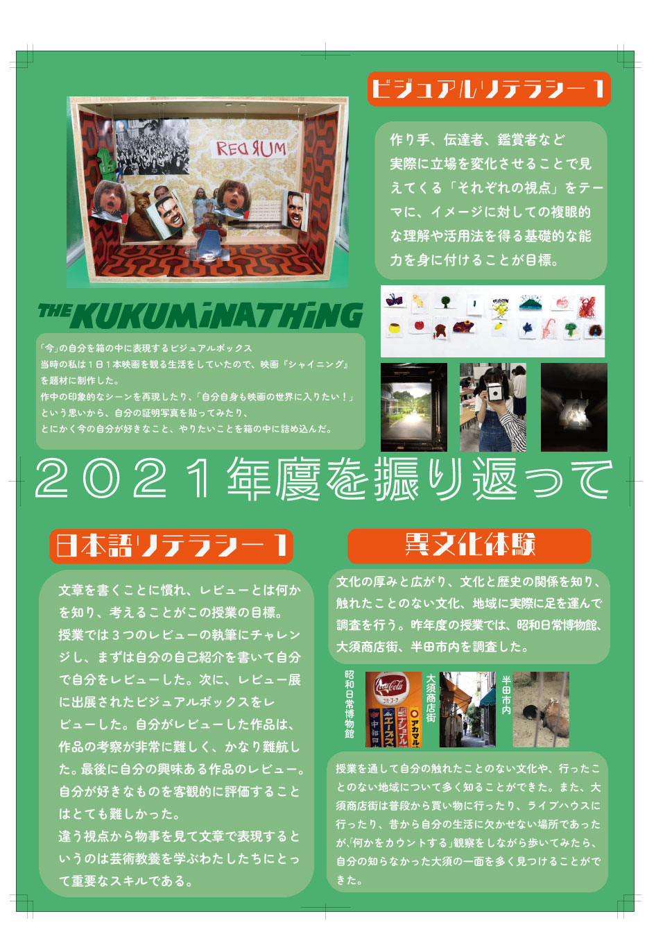 1年次に受けて印象に残った授業についてまとめたポスターで、1年後期に習得したIllustratorの技術を活かして1年間の成長を表現しました。文字数が多くなり過ぎてしまったり、見やすいレイアウトを考えたりと、展示されることを見据えて見た人の目に留まりやすいデザインになるように工夫しました。