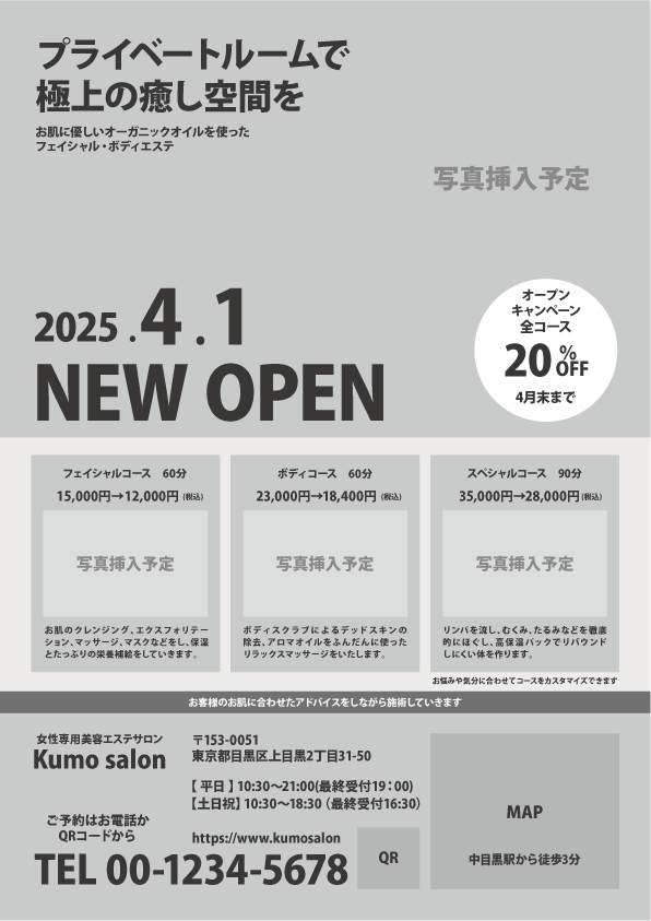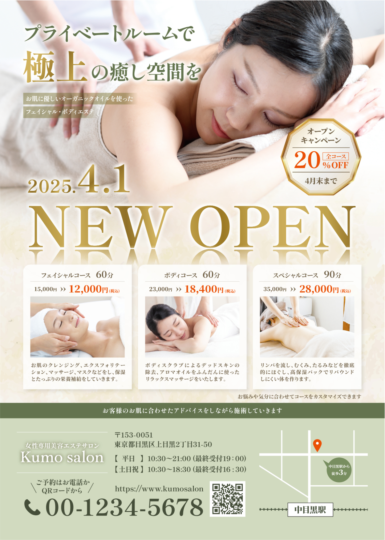 エステサロン様 NEW OPENフライヤー なな Web・グラフィックデザイナー OVERVIEW 女性専用美容エステサロンオープンにあたり、認知獲得を目的とした フライヤーを制作しました。 店内に使用されている、白・ゴールド・グリーンを基調に、上品で落ち着いた印象に仕上げました。大理石調の背景を使用し、文字を反射させることにより、高級感のある雰囲気を演出しました。【 ワイヤーフレーム 】