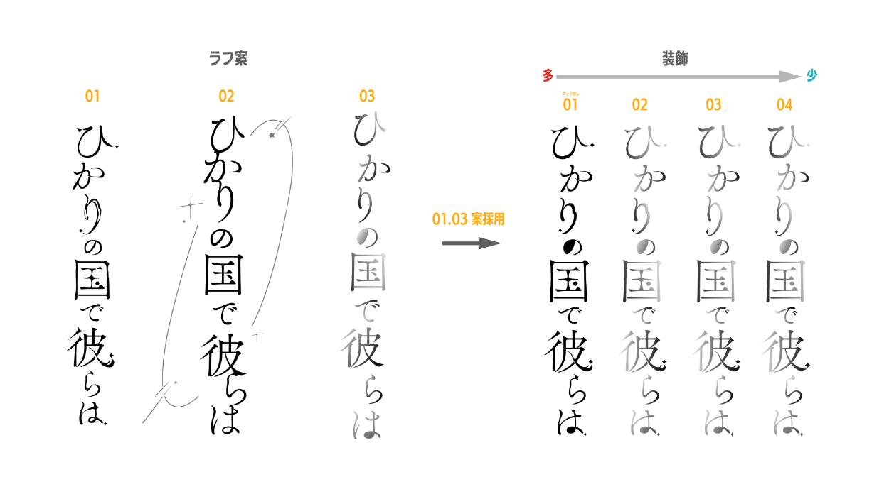 光をイメージしたデザインのラフを3案制作し、米戸様とご相談させていただきながら、装飾の多さや配色を決めました。