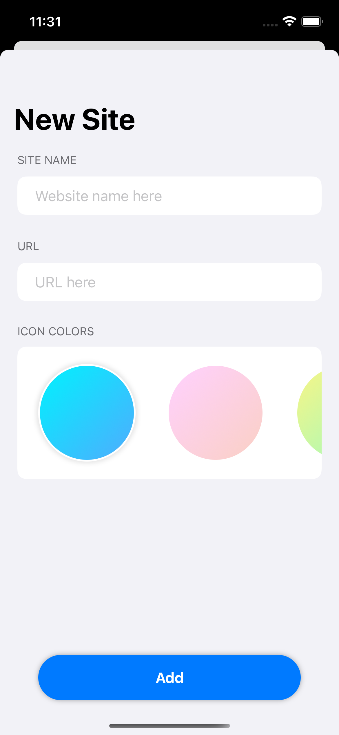 画面左下にある追加アイコンを押すと、サイトの登録画面が現れ入力していくと、画面下部にサイトアイコンが現れます。