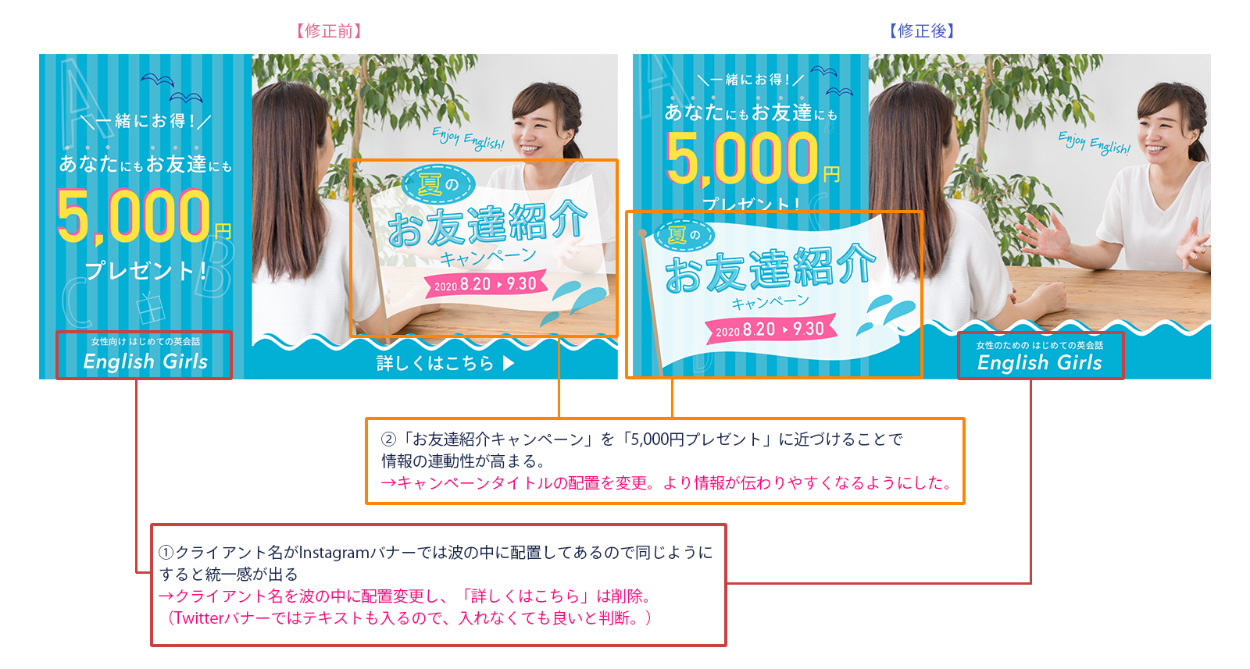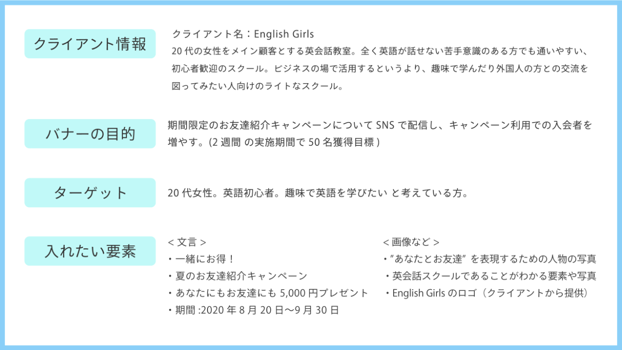 SHElikes MULTI CREATOR COURSEの課題でバナー制作に取り組みました。英会話教室からキャンペーンのバナー制作依頼を受けたという架空の設定で制作しました。(使用ツール:Photoshop)