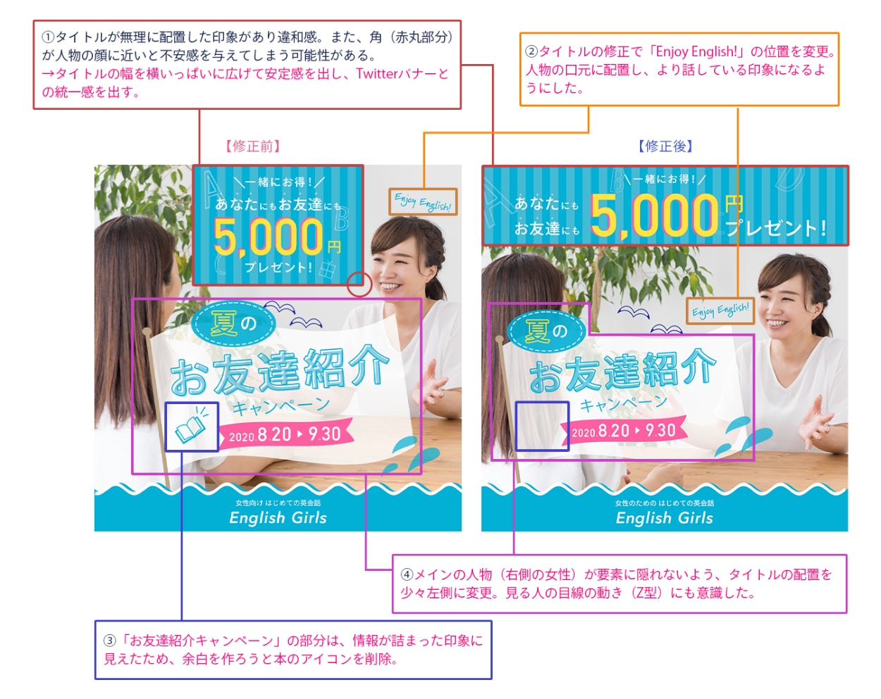 背景にアルファベットの文字を散りばめる、「Enjoy English!」の文字を置くなどして、ふと見たときに英会話についての広告だと認識してもらうことを目指しました。