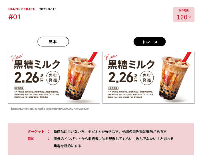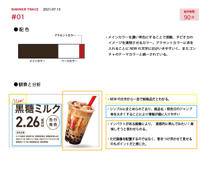 ・なるべく見本と近い文字フォントをあて、バナー全体に違和感がでないよう文字の間隔を微調整を行いました。また、タピオカの下についている影は3種類の円を重ね、円それぞれの色の透明度の微調整を行いながら作成しました。