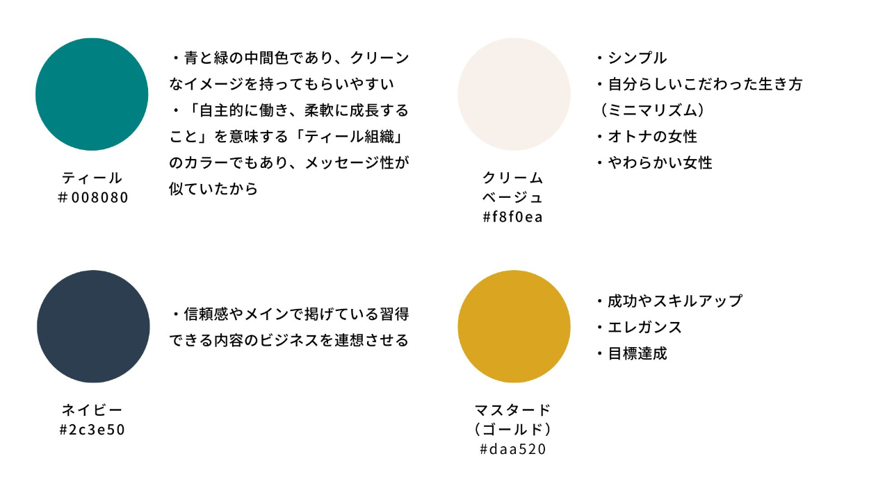 以上の今回のスクールのコンセプトとペルソナから、イメージに合う4色をピックアップしました。