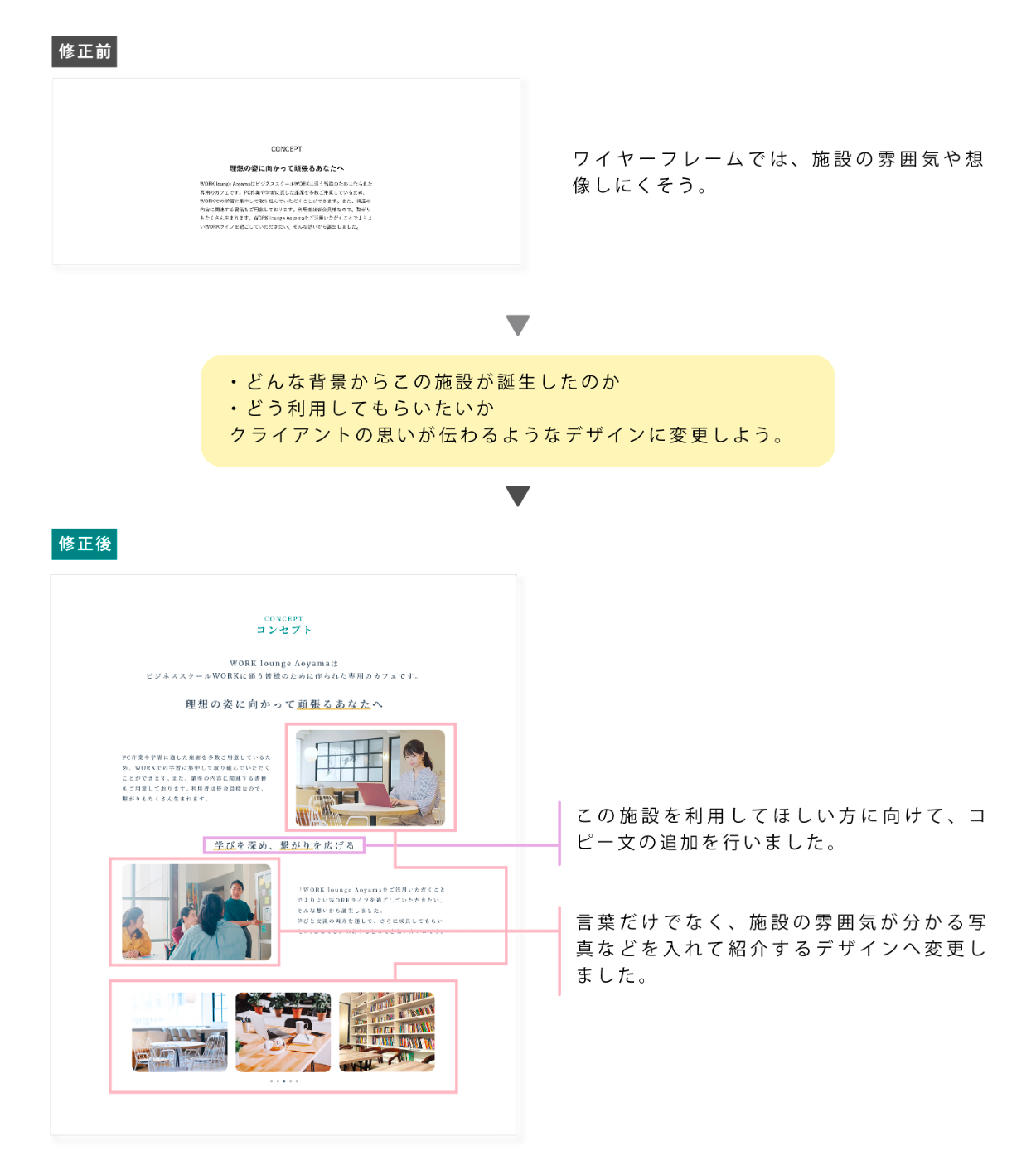 「ペルソナが抱えている具体的な課題」や「優先順位の整理」も同時に行うことで、ワイヤーフレームからデザインカンプまでの間に、よりクライアントに沿ったデザインをご提案できるのではないかと思いました。