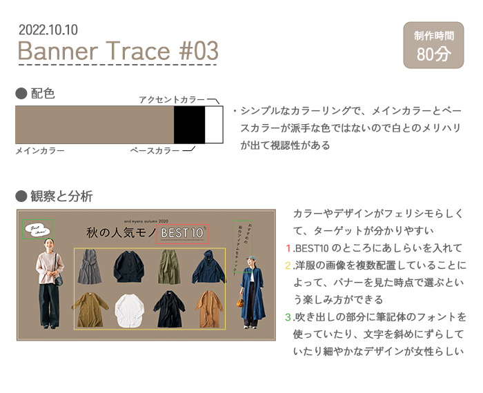 ・今まで明るいカラーをアクセントでいれることで、目立たせることができると思っていましたが、ここまでシンプルな色しか使っていなくても、あしらいをいれることで目に入るような工夫ができると いうことを学びました。