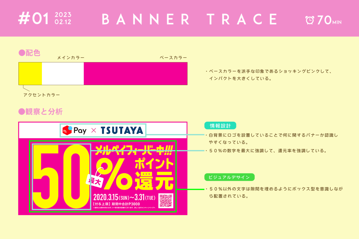 バナトレは今まで何度かしたことがありましたが、最後の分析は今までで一番時間を掛けて取り組めました。そして1枚のバナーのターゲットや目的はこんな意味もあったのではないかと気づくことが意外にも多くて、デザインの配置や配色だけ感じ取るのではなく、見えない部分を把握する重要性を学ぶことが出来たと思いました。