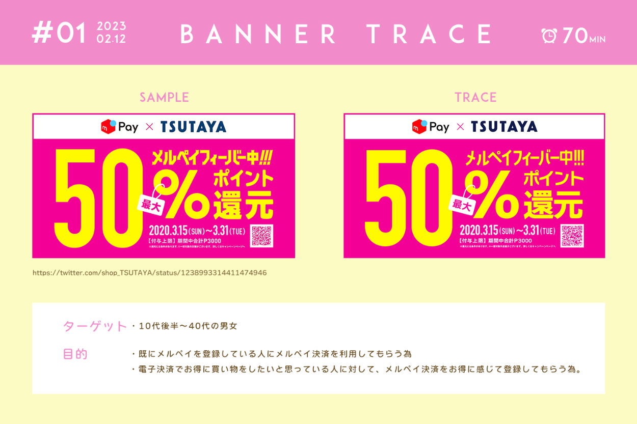 SHElikes MULTI CREATOR PROJECT にてバナートレース課題に取り組みました。また、「ターゲット」「目的」「配色」等についての分析結果もまとめました。| [制作時間 1H / 使用ツール:Photoshop]