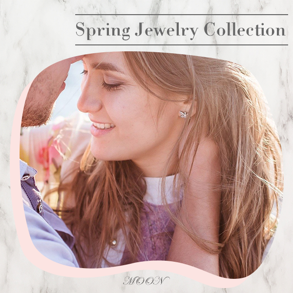 基本の画像は、イメージがつくような身に着けている画像を使用。流体シェイプで切り抜くことで可愛らしさと優しい印象を意識。より効果的に見せるために同形の#fce4e2をずらして配置しました。背景には大理石風の背景を使用しています。
