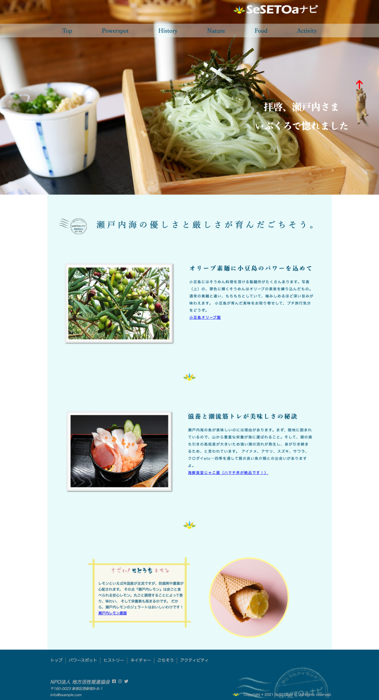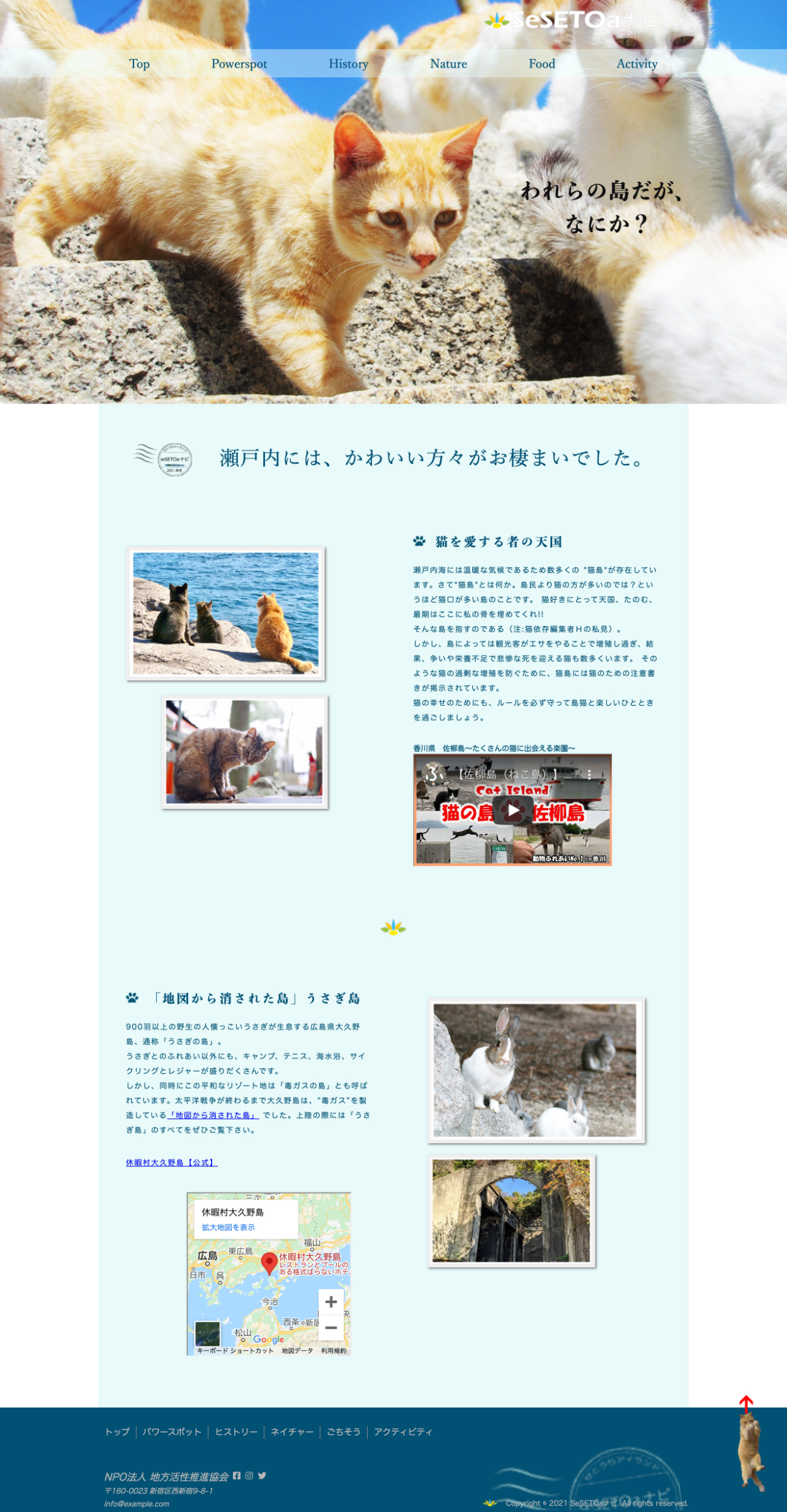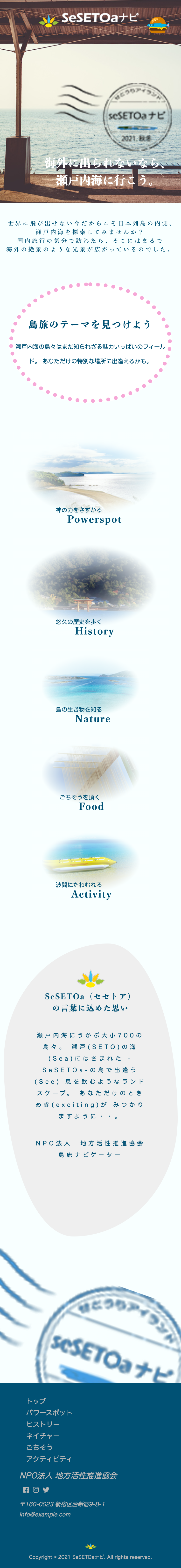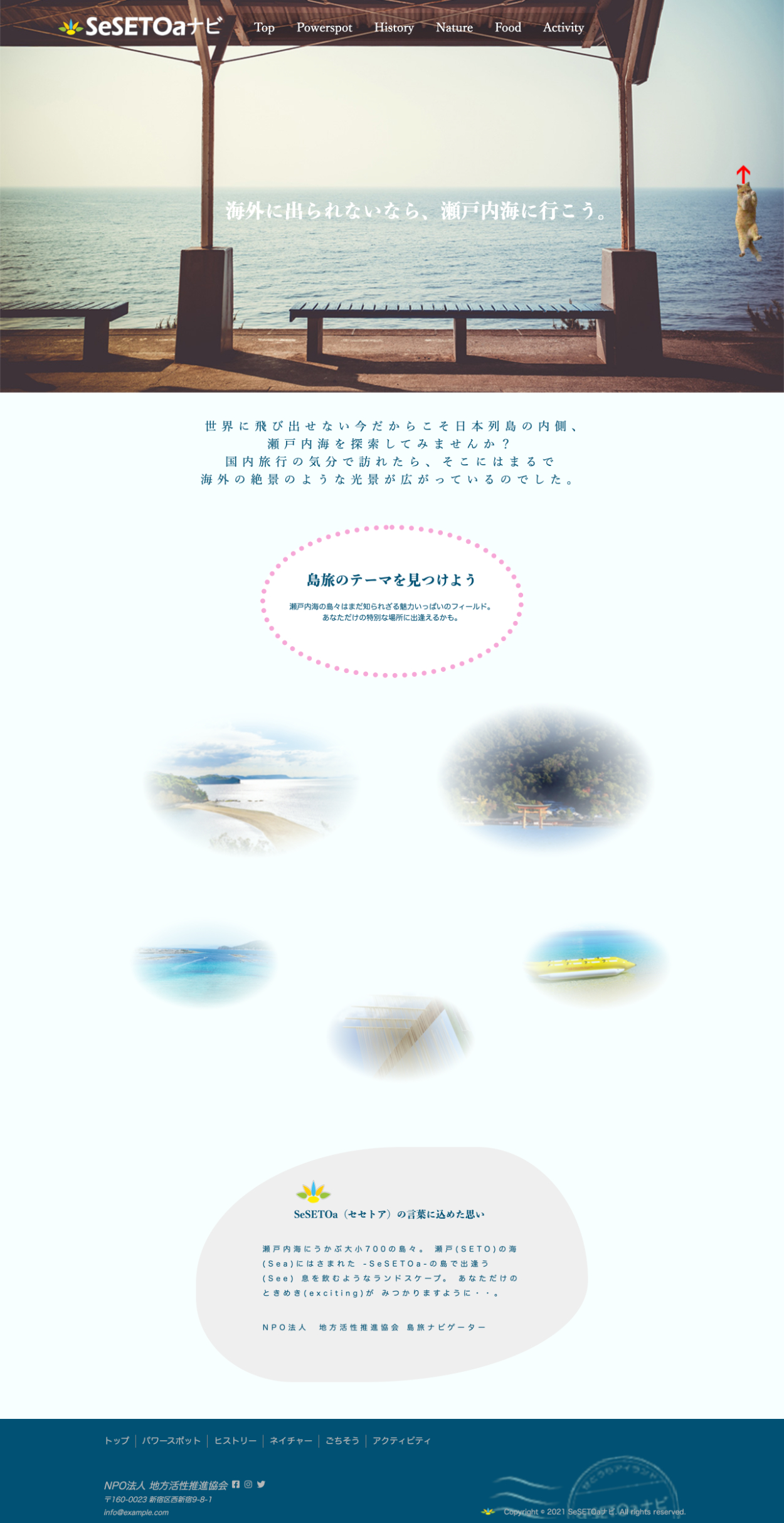 - Webサイトを立ち上げる目的 | 瀬戸内海(島々メイン)の魅力再発信。コロナ禍で内外の観光が困難なため、瀬戸内海に海外のような絶景があることをアピール。地方を応援、再活性化したい。地方から日本を元気にして、経済を回していく。
