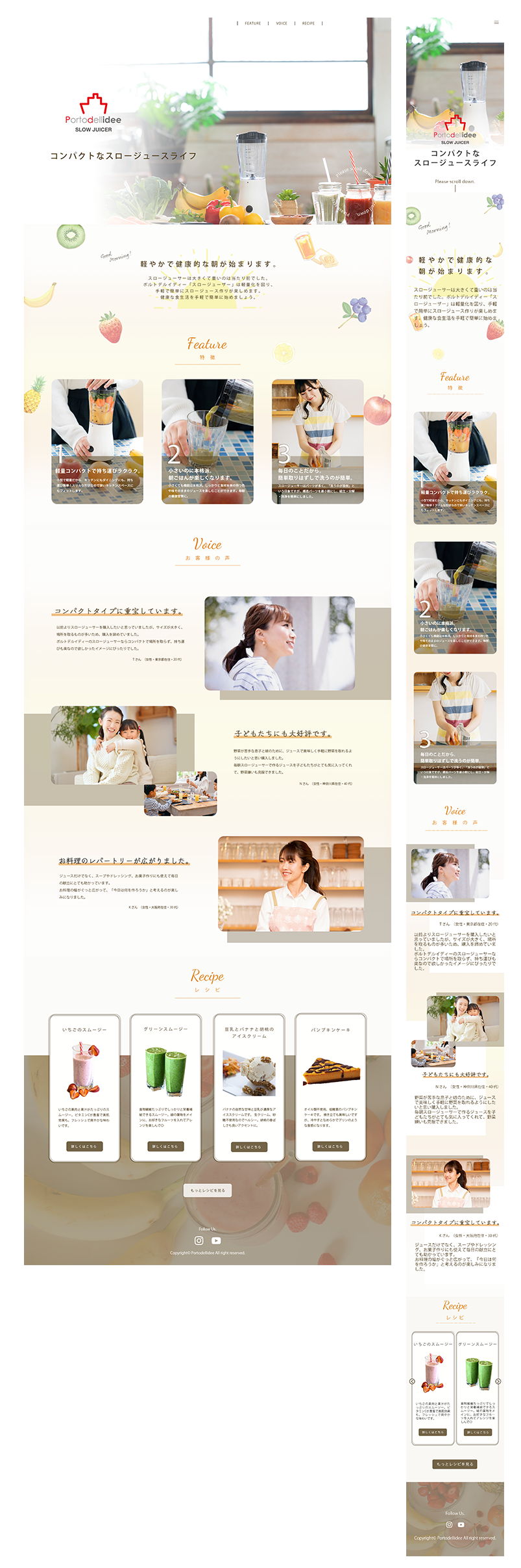 職業訓練校での課題として、イタリアの家電メーカーから発売のスロージューサーのPRサイトを制作しました。クライアントから掲載内容の要望書を元にPCとSPのデザインカンプを制作しました。