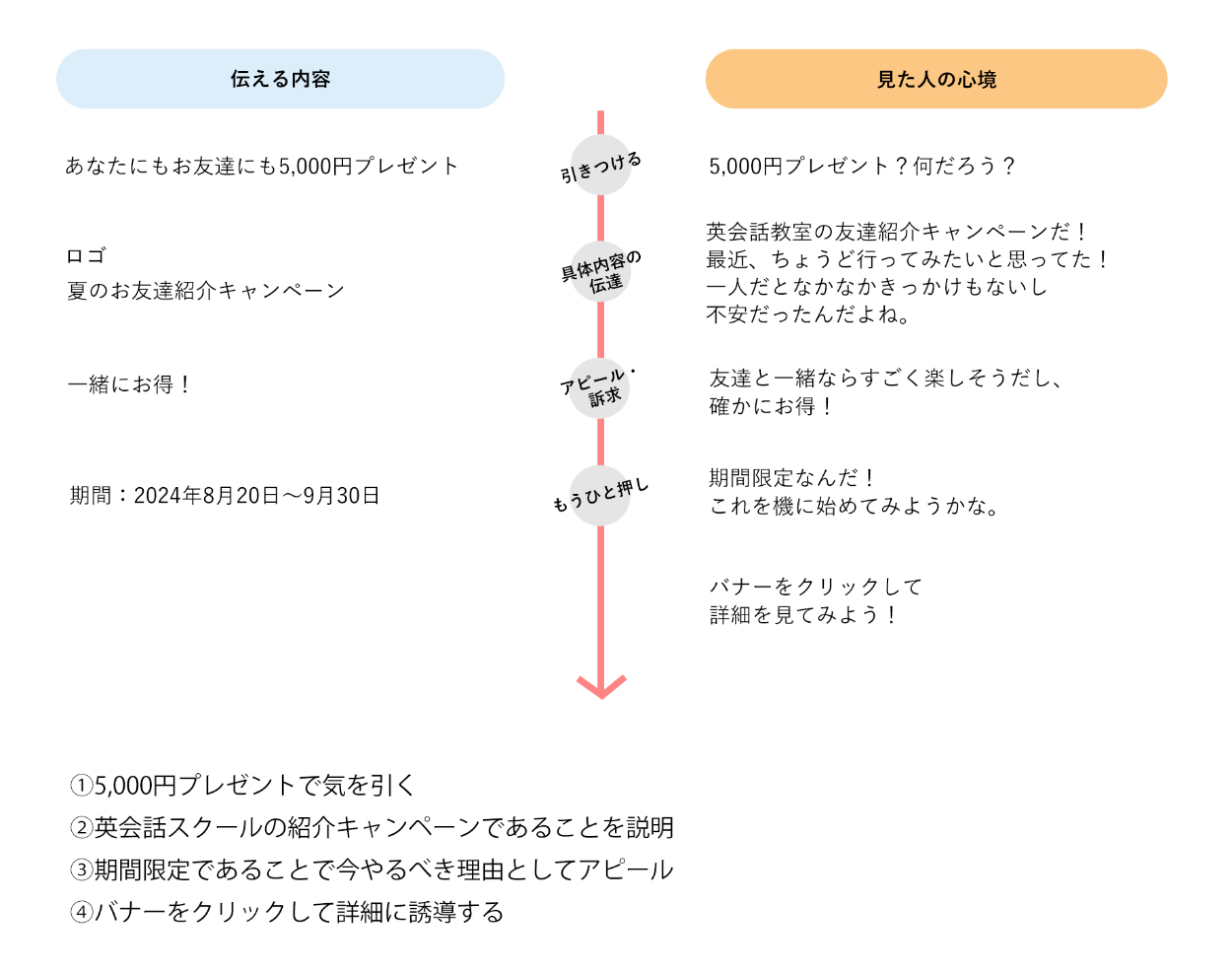 - <外国人講師の写真+Let's Enjoy!>という要素を入れることで、英会話スクールの広告であることをアピールしました。