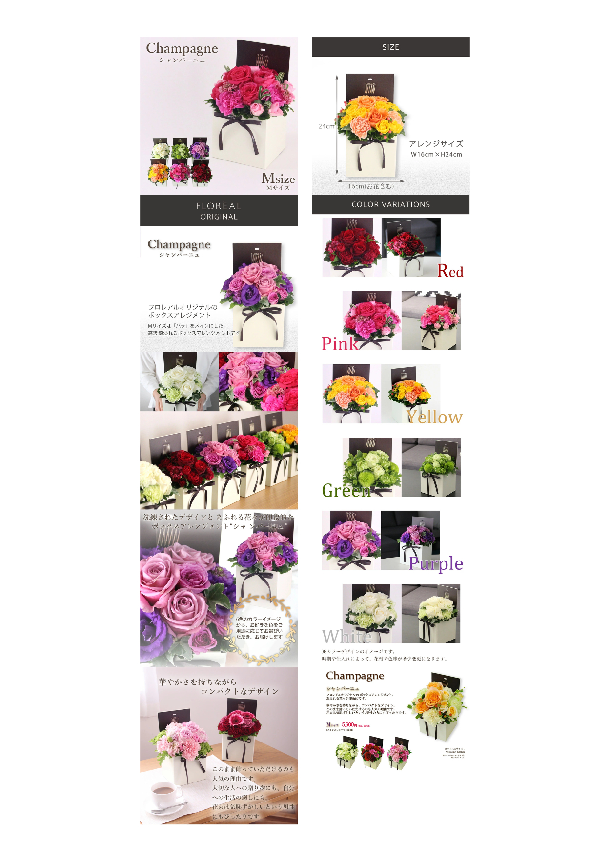 楽天モールに入っているお花屋さんの商品ページの制作。類似商品やサイズ違い、サイズによる入っている花の違いなどがあるため、そちらの違いが出るように制作した。