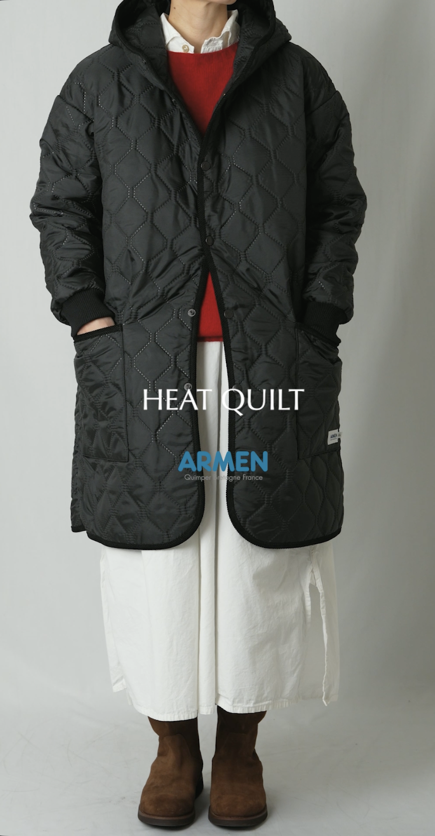 定番アイテム「HEAT QUILT」販促用に作成、着用するときのイメージと、ディテールが伝わる様にしつつも見やすくコンパクトにまとめました。