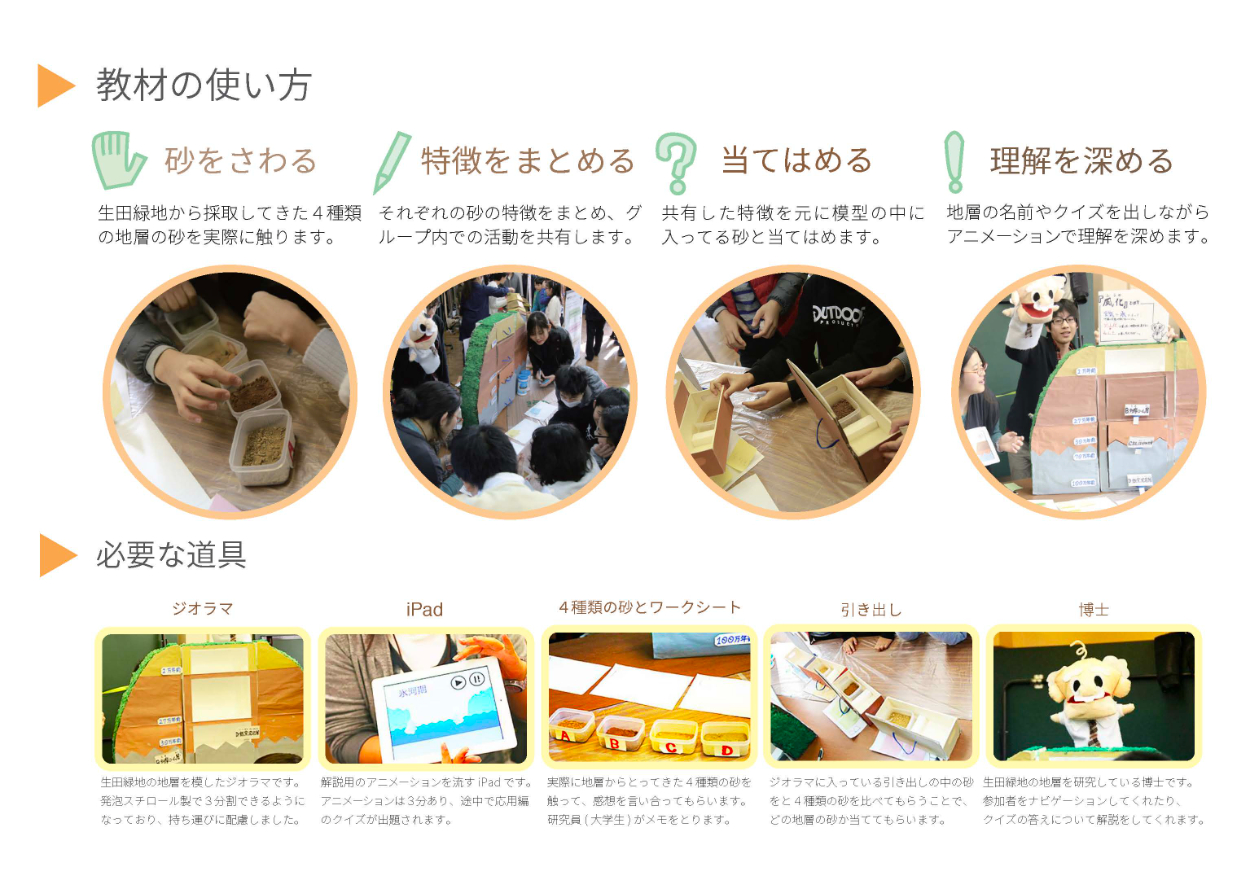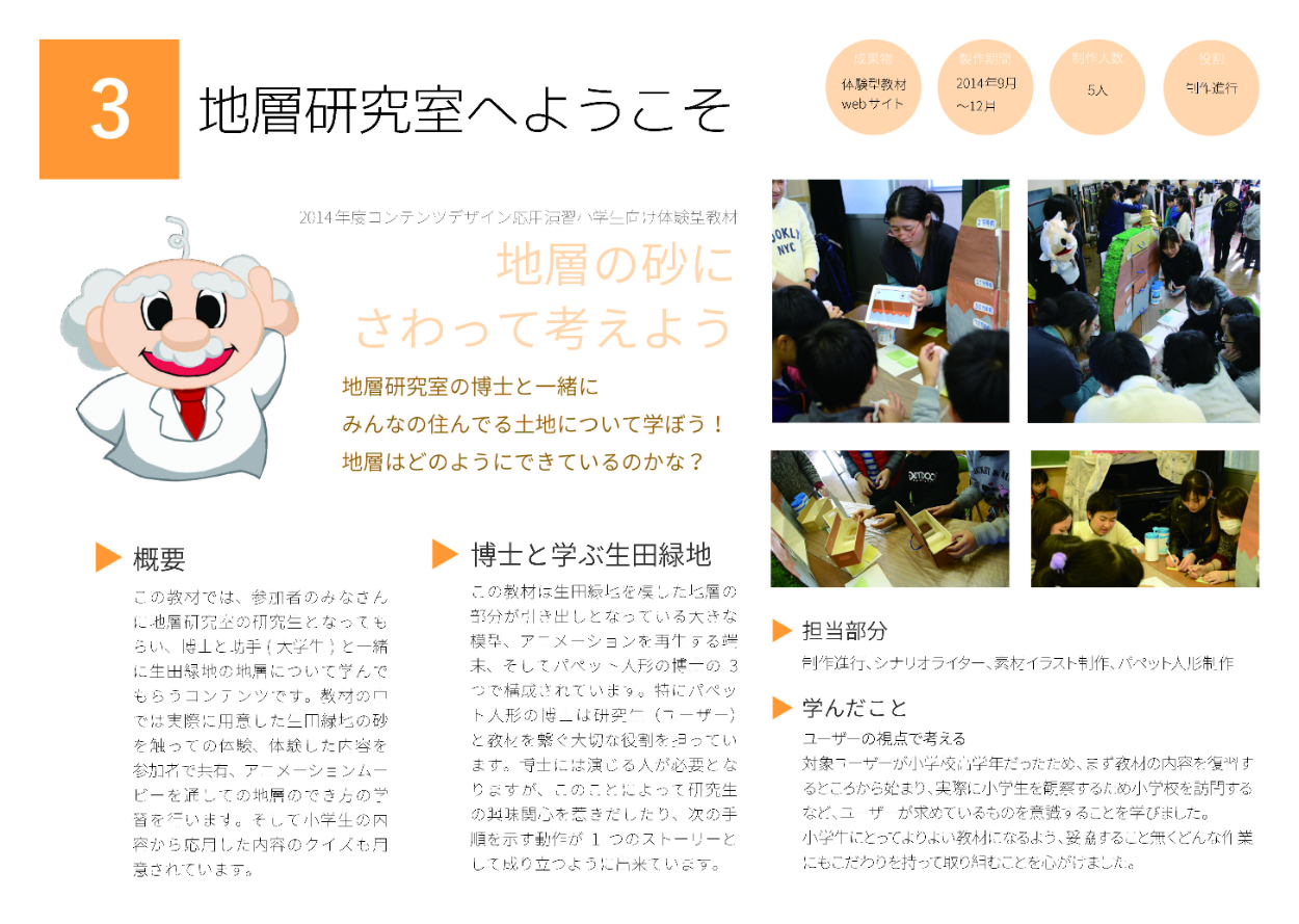 小学生向けの教材作成をグループ学習として作成。学習テーマの「地層」を学ぶため、舞台設定を地層研究室とし、ターゲットユーザーである小学生は研究生となって実際に地層の砂を触りながらナビゲーターである博士(パペット人形)とともに学んでいくコンテンツ。実際に小学生に向けて発表会でプレゼンを行った。