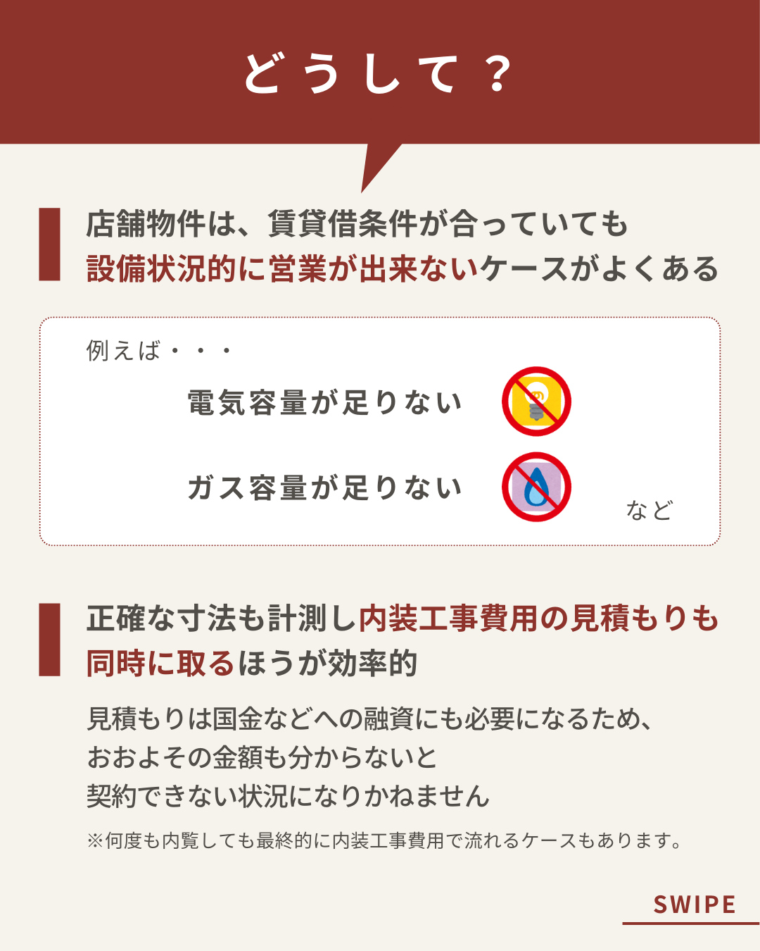 不動産アカウントにて「お店を持ちたい方」が店舗内覧する際に注意して欲しいことをまとめた投稿です。クライアントさんからいただいた文章をもとに、構成・素材選定・文章のリライト・デザインを行いました