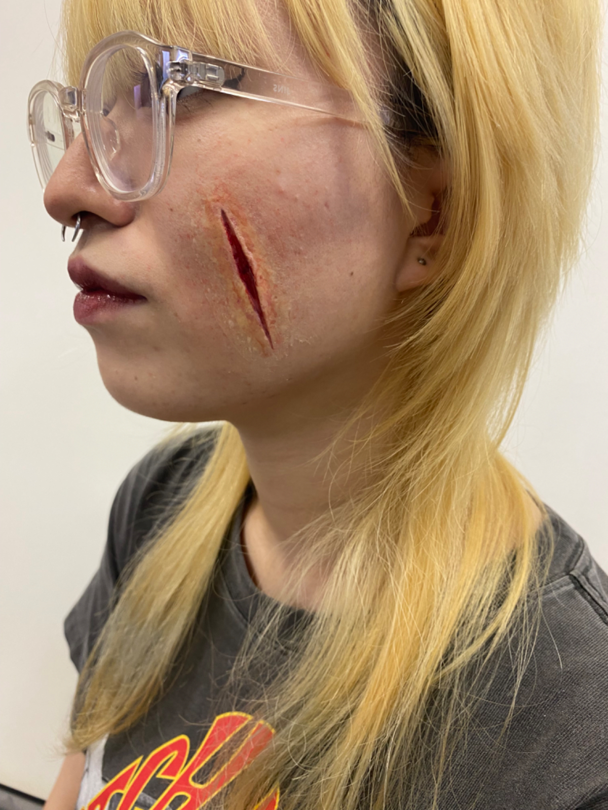 トランスファーを使った傷メイクです。刃物で切られた傷を彫刻してトランスファーにしました。