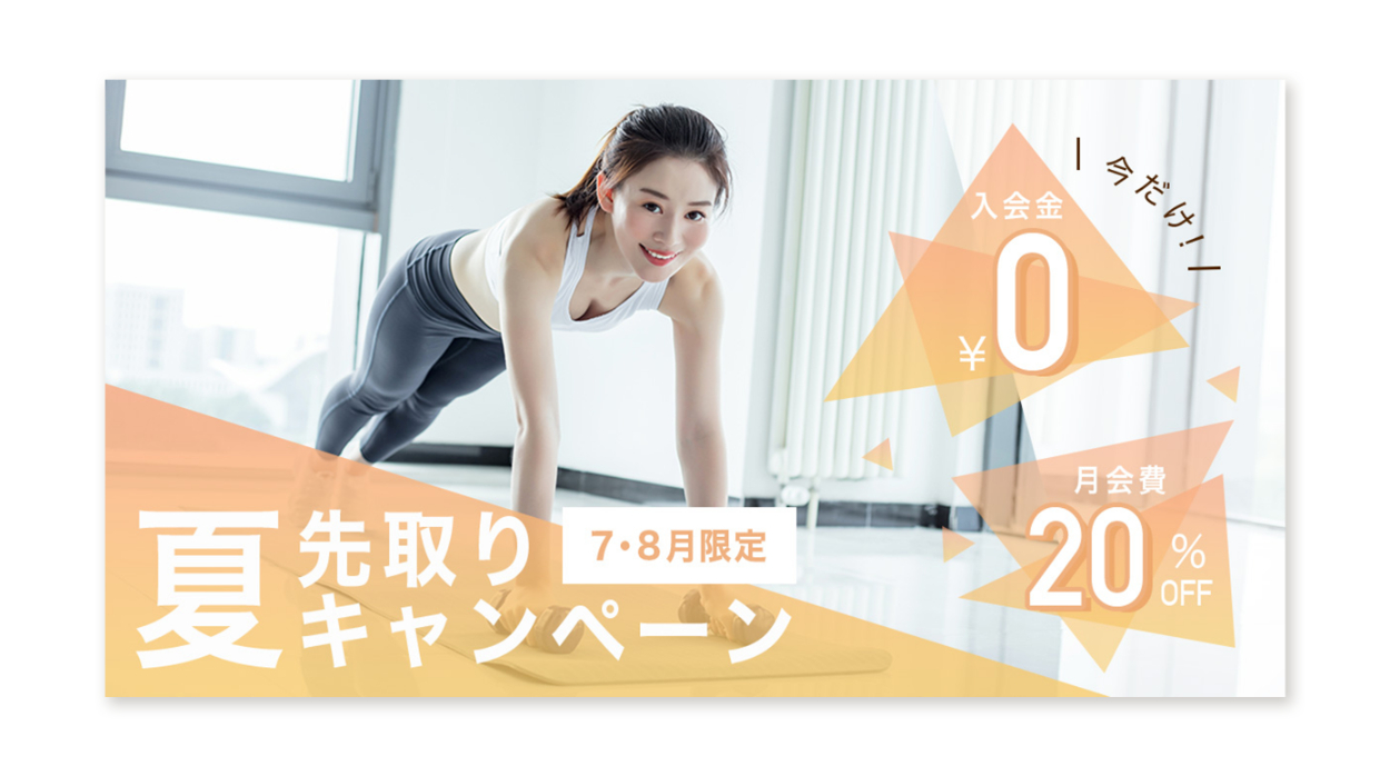 7月~8月限定のお得なキャンペーン広告を製作したい。スポーツジムに通ったことがない方でも気軽にお試しできるということを認知してもらい、顧客を獲得したい。
