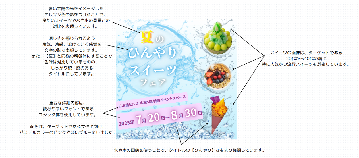 また、【ひんやり】という言葉で感じる【涼しさ】をパステルカラーの淡いブルーと白で表現することで、【夏】という【暑い】印象の言葉との対比にもなっています。