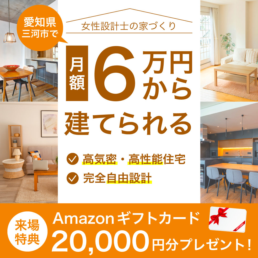 「月額6万円から」という費用訴求と20,000円分の来場特典を組み合わせ、安心感と具体性を持たせたデザインに仕上げました。ナチュラルモダンな住宅写真を配し、理想の暮らしをイメージさせる構成を意識しています。