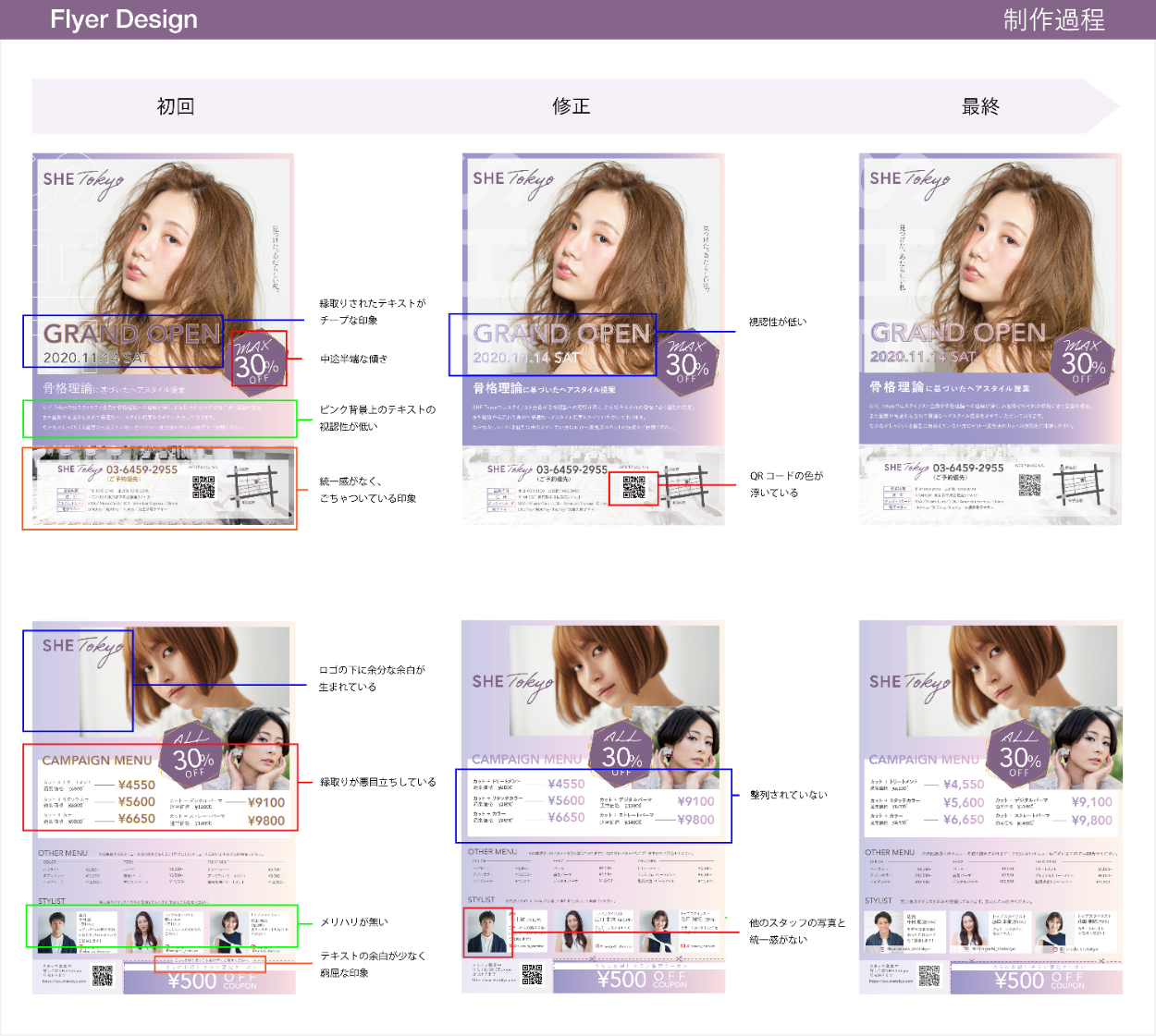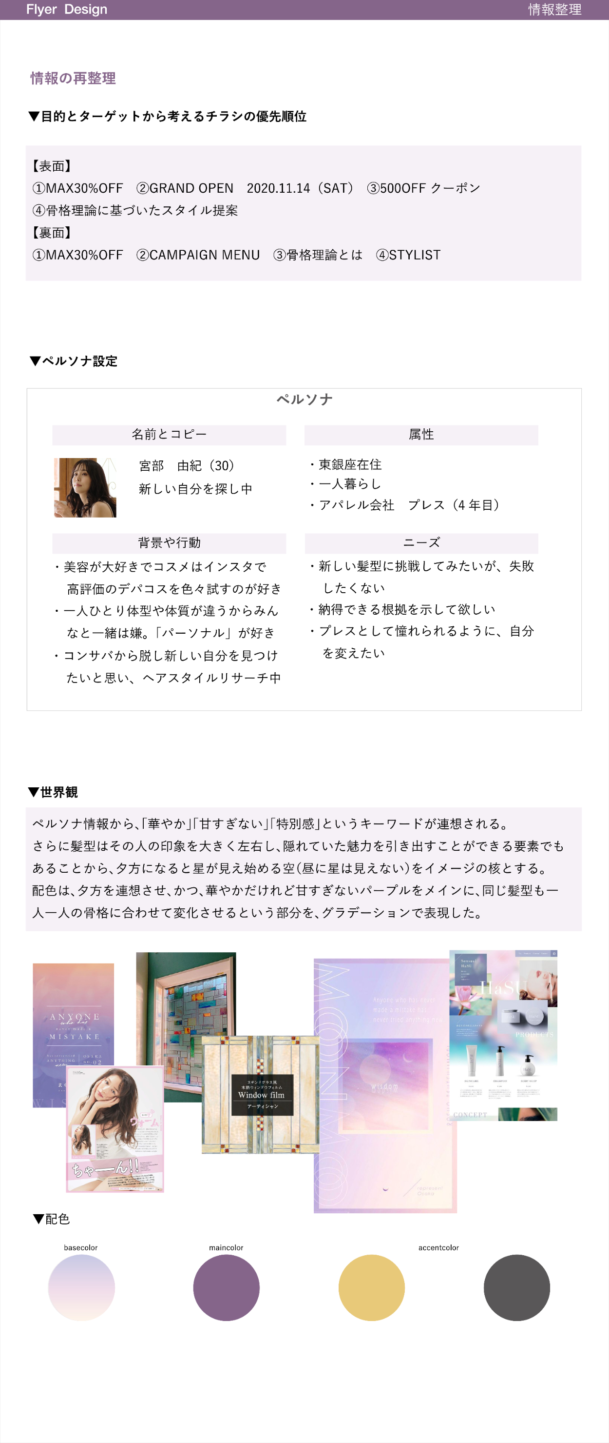 SHElikes MULTI CREATOR COURSE Designerの課題として、フライヤー制作に取り組みました。ペルソナ設定から制作までを行いました。