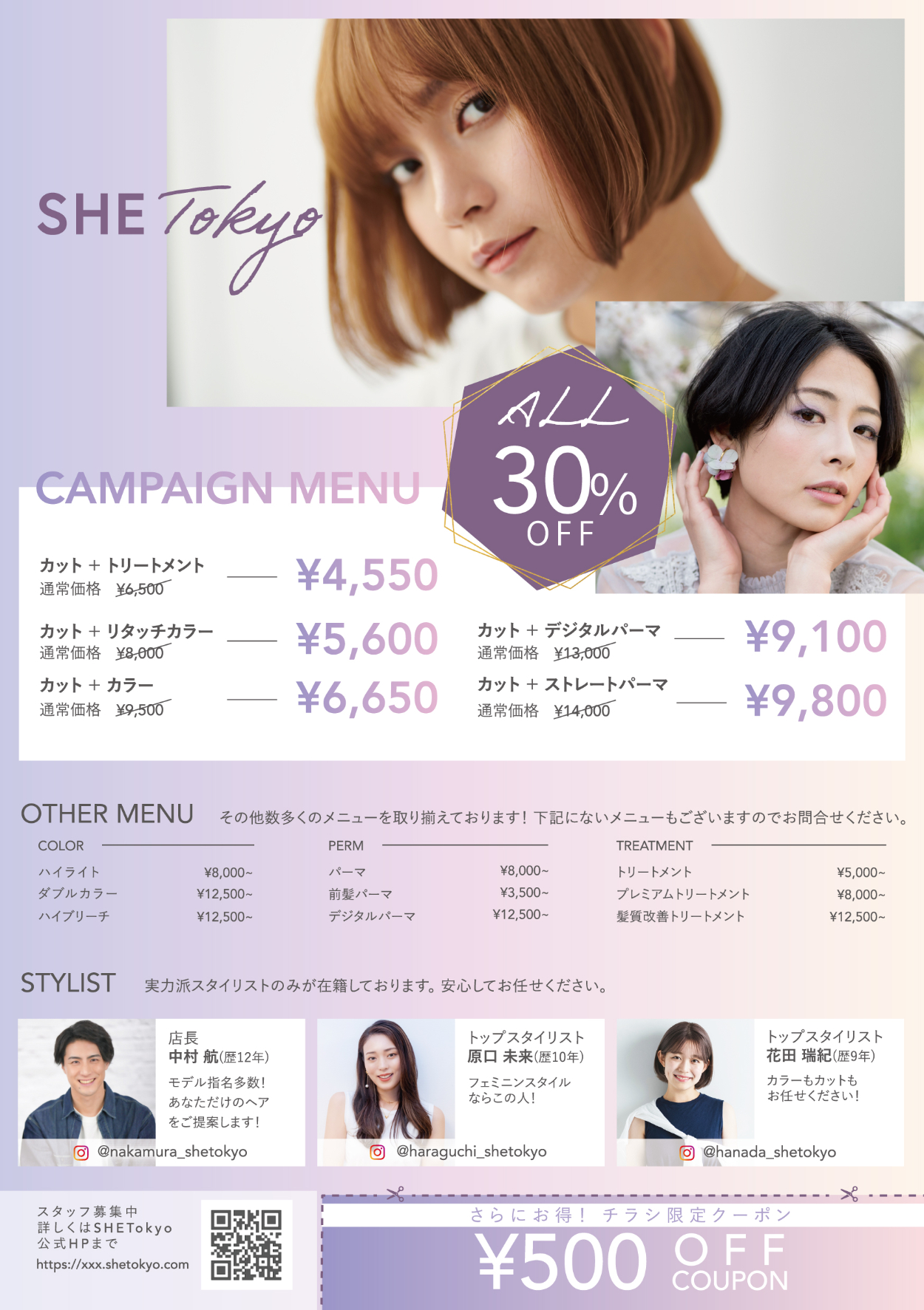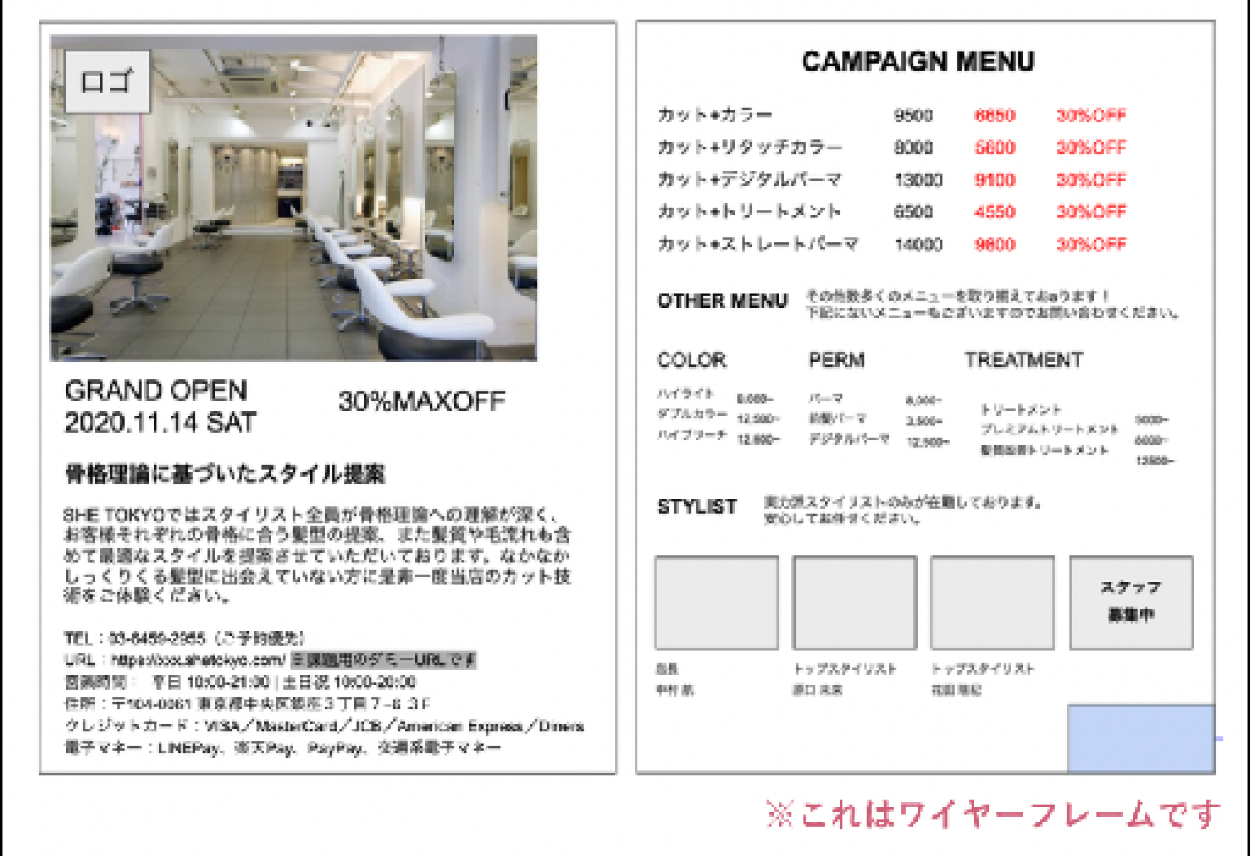 オモテやスタイリスト紹介の部分には自分で考えたコピーを入れ、より印象深い作りにした。
