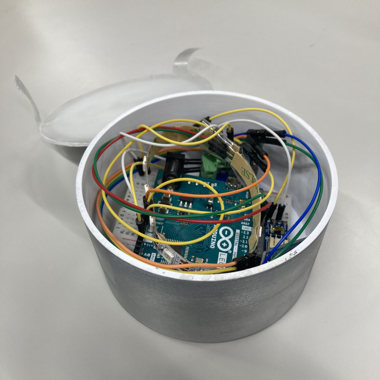 大きさは一般的なガムテープと同じくらいです。3Dプリントで作られた本体には、マイクロコンピュータ、円状のLEDライト、バッテリーなどが格納されています。